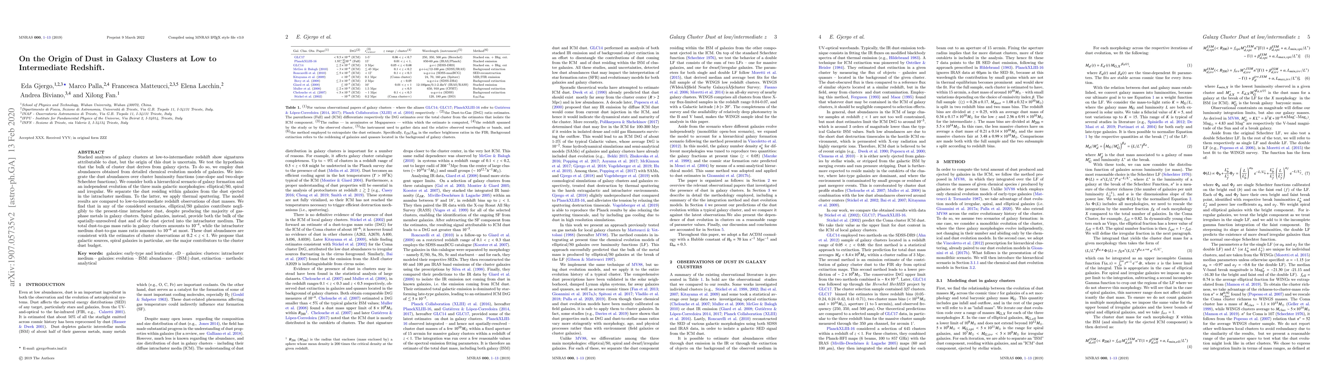 Research suggests that spiral galaxies contribute to galaxy cluster dust budgets, while elliptical/S0 galaxies play a negligible role, contradicting the initial hypothesis of dust originating from galaxy ejecta.