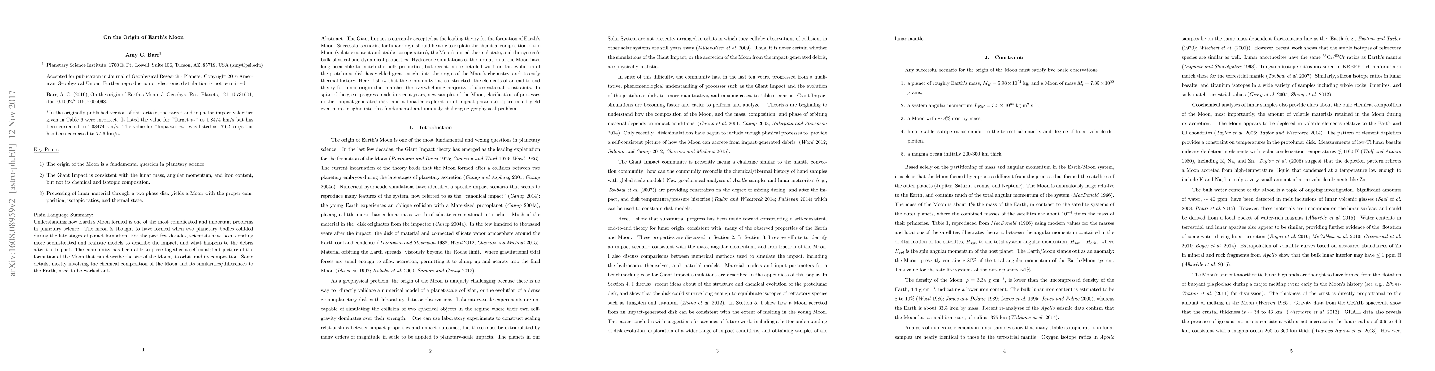 The Giant Impact theory is the leading explanation for the Moon's formation, successfully matching bulk physical and dynamical properties, while recent simulations also explain its chemical composition and thermal history. Further exploration and new lunar samples could provide deeper insights into this geophysical process.