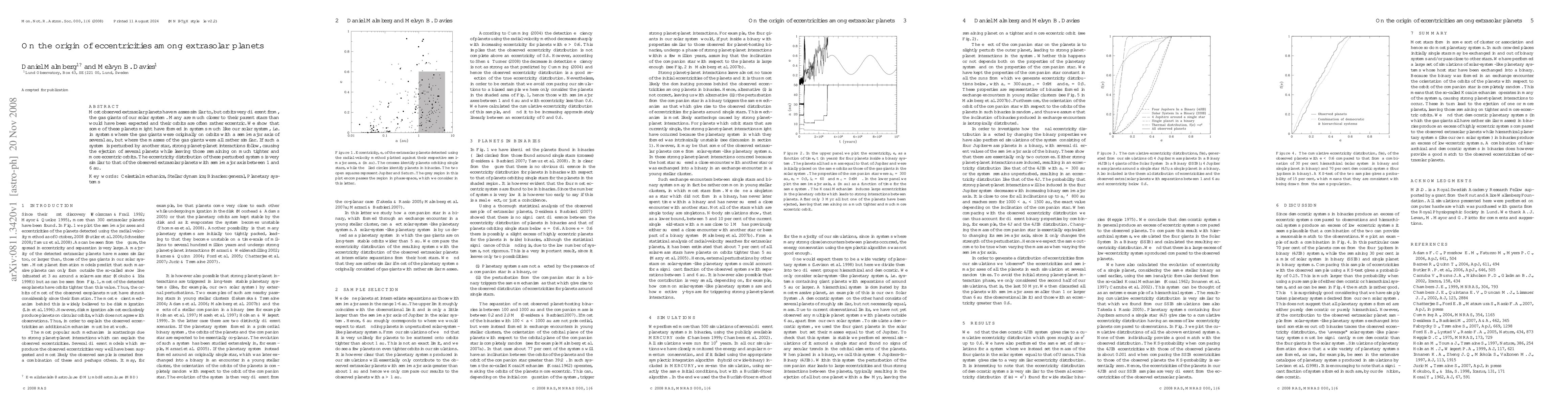 This paper proposes that many extrasolar planets with eccentric orbits formed in systems similar to our solar system, but were later perturbed by another star, leading to planet ejections and the remaining planets adopting tighter, more eccentric orbits. The resulting eccentricity distribution matches observations of extrasolar planets between 1 and 6 au.