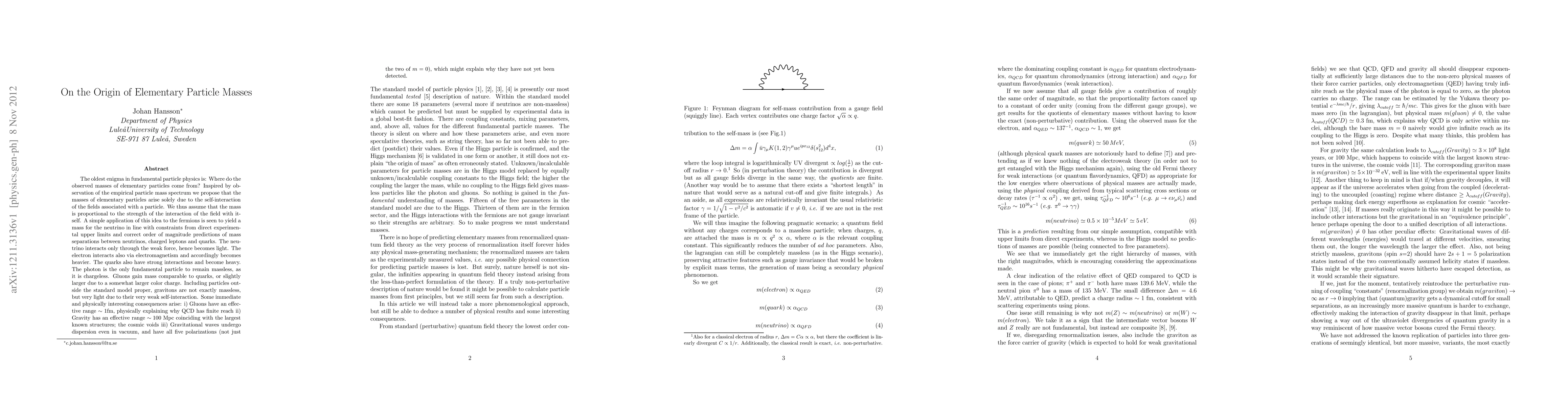The oldest enigma in fundamental particle physics is: Where do the observed masses of elementary particles come from? Inspired by observation of the empirical particle mass spectrum we propose that the masses of elementary particles arise solely due to the self-interaction of the fields associated with a particle. We thus assume that the mass is proportional to the strength of the interaction of the field with itself. A simple application of this idea to the fermions is seen to yield a mass for the neutrino in line with constraints from direct experimental upper limits and correct order of magnitude predictions of mass separations between neutrinos, charged leptons and quarks. The neutrino interacts only through the weak force, hence becomes light. The electron interacts also via electromagnetism and accordingly becomes heavier. The quarks also have strong interactions and become heavy. The photon is the only fundamental particle to remain massless, as it is chargeless. Gluons gain mass comparable to quarks, or slightly larger due to a somewhat larger color charge. Including particles outside the standard model proper, gravitons are not exactly massless, but very light due to their very weak self-interaction. Some immediate and physically interesting consequences arise: i) Gluons have an effective range $\sim 1$fm, physically explaining why QCD has finite reach ii) Gravity has an effective range $\sim 100$ Mpc coinciding with the largest known structures; the cosmic voids iii) Gravitational waves undergo dispersion even in vacuum, and have all five polarizations (not just the two of $m=0$), which might explain why they have not yet been detected.