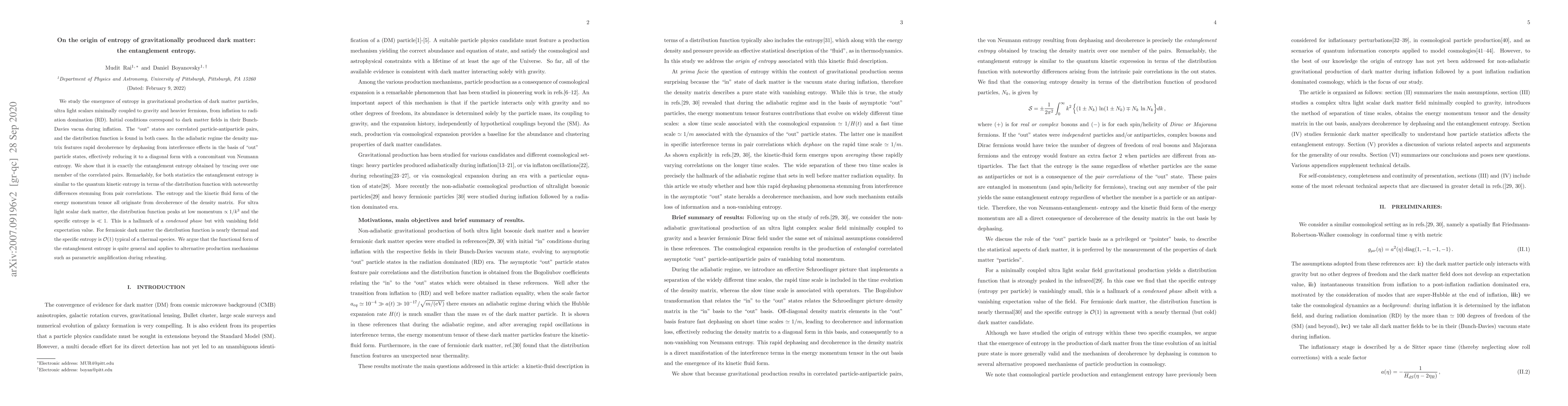 This paper investigates the entropy emergence in gravitationally produced dark matter, showing that the von Neumann entropy corresponds to the entanglement entropy from decoherence in the density matrix. For ultra light scalar dark matter, the entropy is low, indicating a condensed phase, while for fermionic dark matter, the entropy is higher, resembling a thermal species.