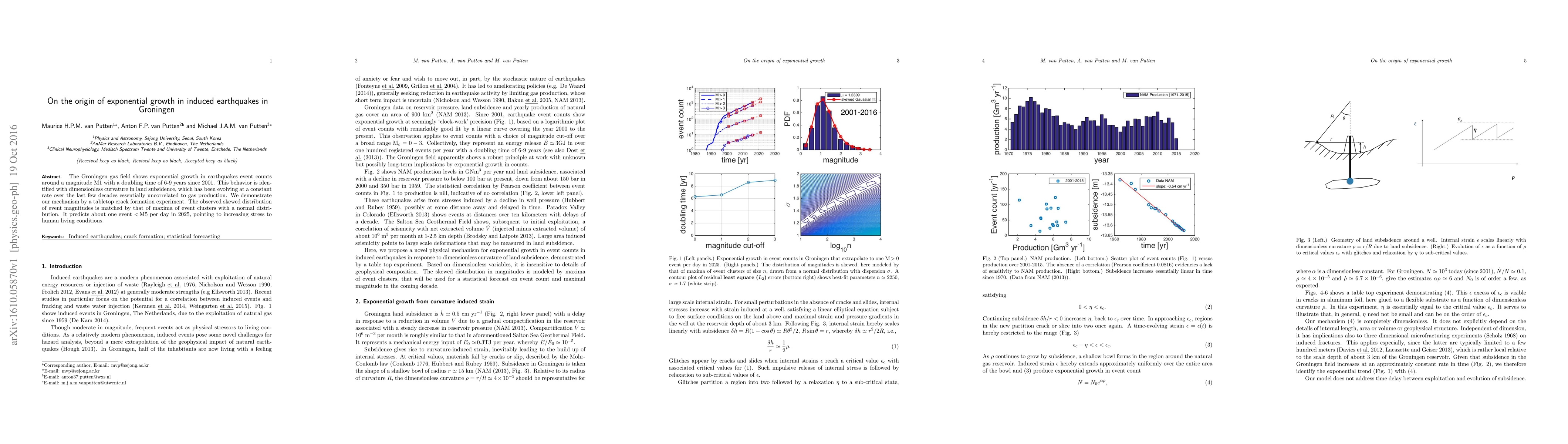 The paper investigates the exponential growth of induced earthquakes in the Groningen gas field, attributing it to land subsidence rather than gas production. The study predicts a significant increase in seismic events by 2025, raising concerns for local living conditions.