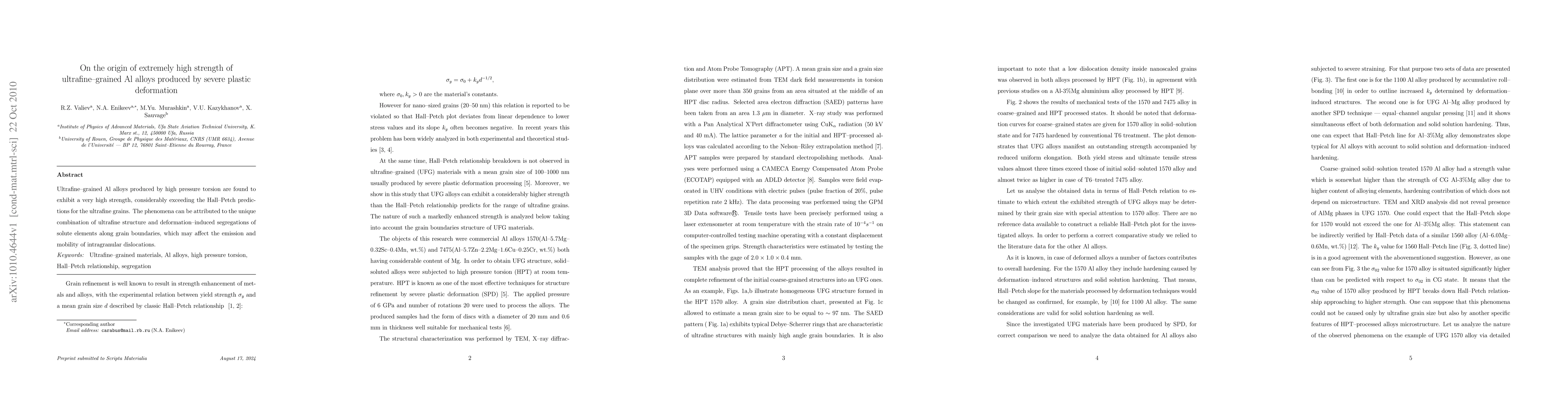 Summary: Ultrafine-grained Al alloys produced via high pressure torsion exhibit extraordinary strength beyond Hall-Petch predictions, attributed to a combination of ultrafine grain structure and solute segregation along grain boundaries affecting dislocation behavior.
