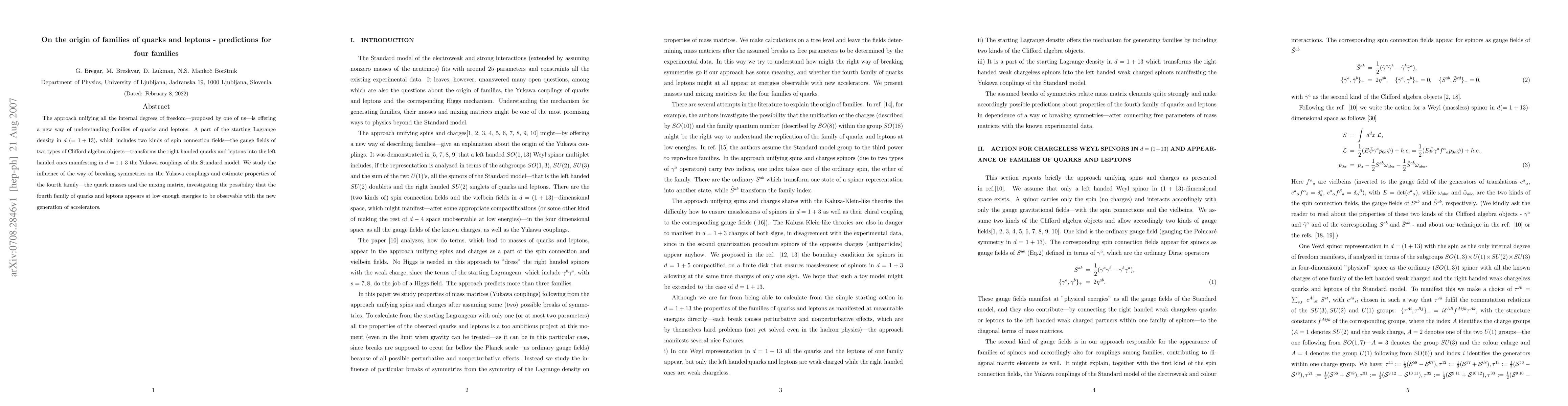 The approach unifying all the internal degrees of freedom--proposed by one of us--is offering a new way of understanding families of quarks and leptons: A part of the starting Lagrange density in d(=1+13), which includes two kinds of spin connection fields--the gauge fields of two types of Clifford algebra objects--transforms the right handed quarks and leptons into the left handed ones manifesting in d=1+3 the Yukawa couplings of the Standard model. We study the influence of the way of breaking symmetries on the Yukawa couplings and estimate properties of the fourth family--the quark masses and the mixing matrix, investigating the possibility that the fourth family of quarks and leptons appears at low enough energies to be observable with the new generation of accelerators.