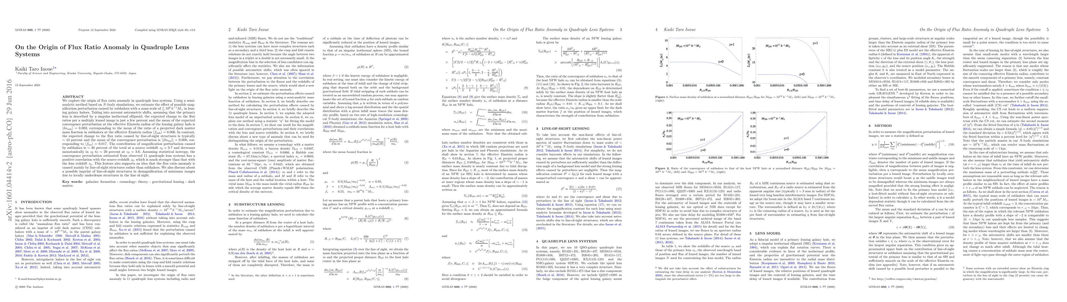 A study investigates the origin of flux ratio anomalies in quadruple lens systems, finding that magnification perturbation caused by subhaloes is a minor contributor, while line-of-sight structures dominate the effect.