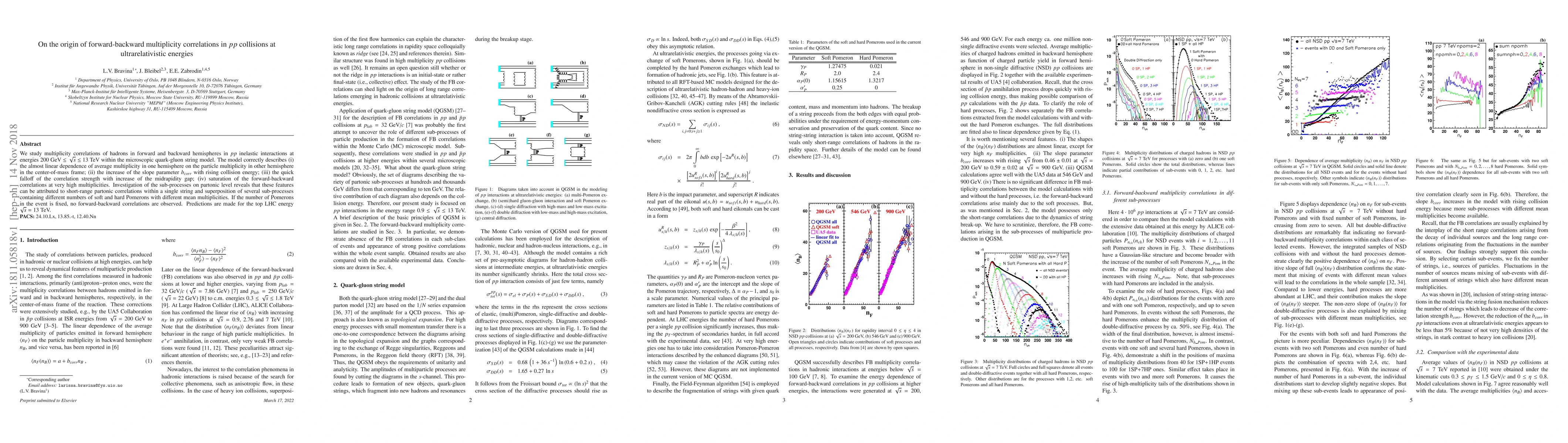This paper investigates multiplicity correlations in $pp$ collisions at ultrarelativistic energies using a quark-gluon string model, which accurately captures the linear dependence of average multiplicity between hemispheres and the energy-dependent slope parameter. The study attributes these correlations to partonic interactions and the superposition of sub-processes involving different Pomerons.