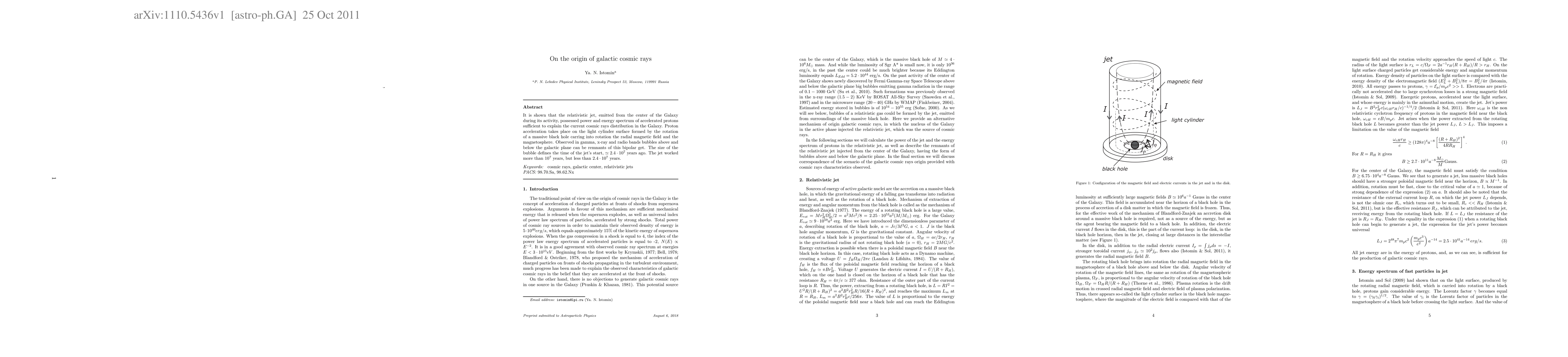 Researchers propose that galactic cosmic rays originate from a powerful relativistic jet emitted by the Galactic center during its activity, which powered proton acceleration on the light cylinder surface of a massive black hole. The jet's existence is dated to approximately 2.4 million years ago and suggests a prolonged period of activity lasting around 10 million years.