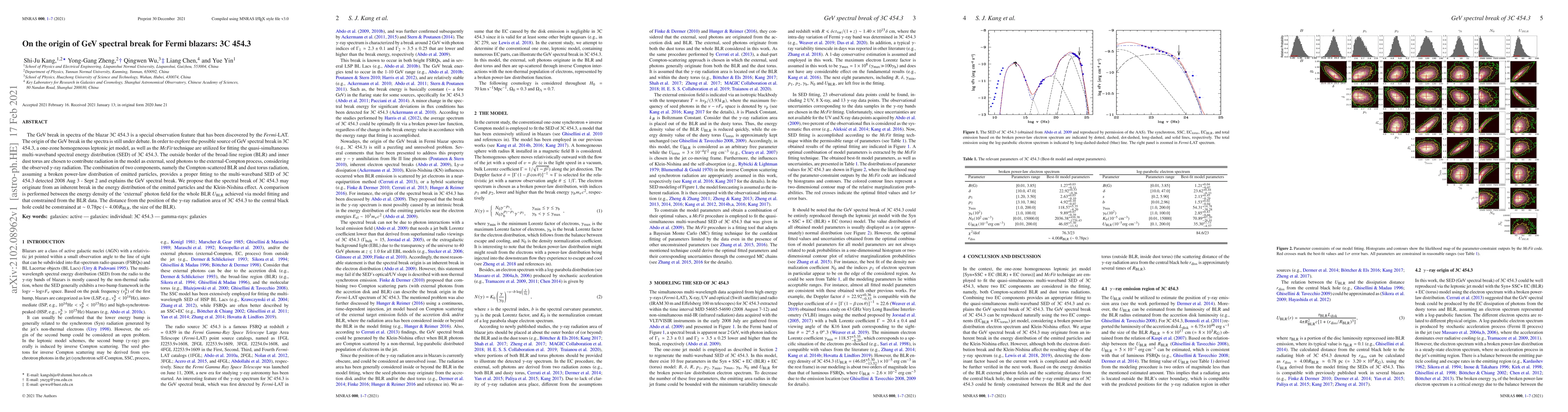 This study investigates the origin of the GeV spectral break in blazar 3C 454.3, employing a one-zone leptonic jet model and the McFit technique to fit its multi-waveband SED. The findings suggest the break originates from an intrinsic particle energy distribution and the Klein-Nishina effect, with contributions from Compton-scattered radiation from the broad-line region and inner dust torus. The research also estimates the gamma-ray emission region's distance from the central black hole at approximately 0.78 pc.