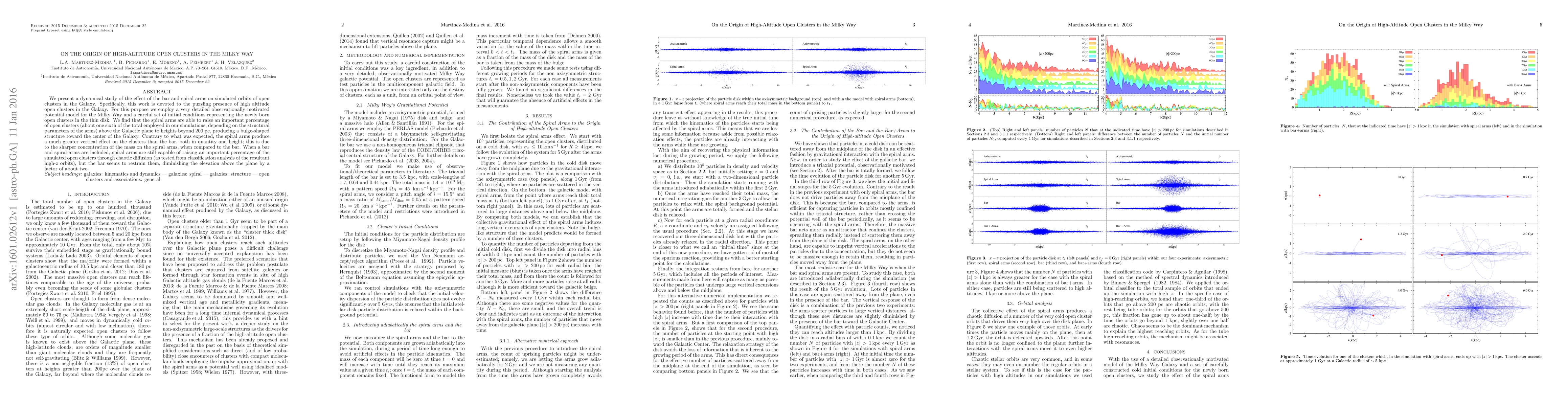 We present a dynamical study of the effect of the bar and spiral arms on the simulated orbits of open clusters in the Galaxy. Specifically, this work is devoted to the puzzling presence of high-altitude open clusters in the Galaxy. For this purpose we employ a very detailed observationally motivated potential model for the Milky Way and a careful set of initial conditions representing the newly born open clusters in the thin disk. We find that the spiral arms are able to raise an important percentage of open clusters (about one-sixth of the total employed in our simulations, depending on the structural parameters of the arms) above the Galactic plane to heights beyond 200 pc, producing a bulge-shaped structure toward the center of the Galaxy. Contrary to what was expected, the spiral arms produce a much greater vertical effect on the clusters than the bar, both in quantity and height; this is due to the sharper concentration of the mass on the spiral arms, when compared to the bar. When a bar and spiral arms are included, spiral arms are still capable of raising an important percentage of the simulated open clusters through chaotic diffusion (as tested from classification analysis of the resultant high-z orbits), but the bar seems to restrain them, diminishing the elevation above the plane by a factor of about two.