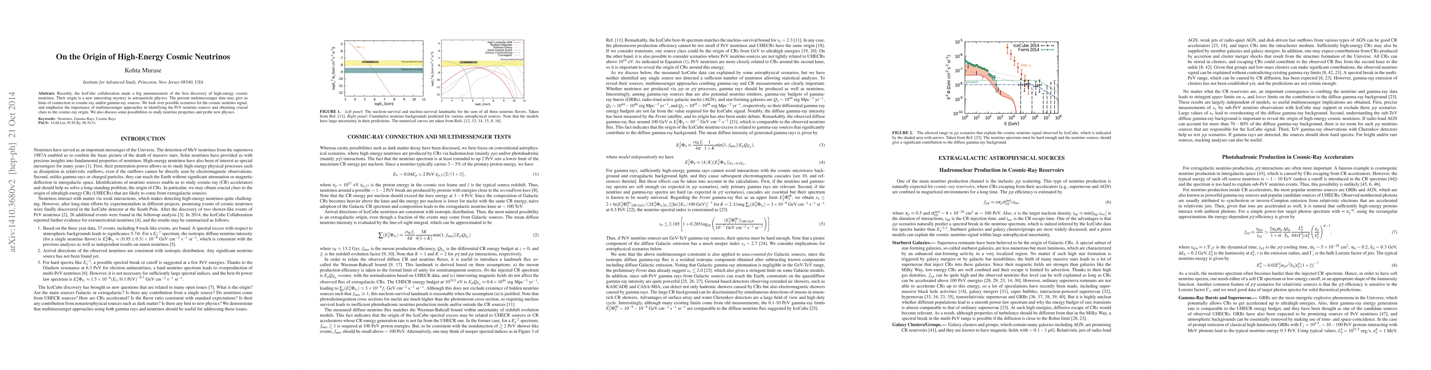 Recently, the IceCube collaboration made a big announcement of the first discovery of high-energy cosmic neutrinos. Their origin is a new interesting mystery in astroparticle physics. The present multimessenger data may give us hints of connection to cosmic-ray and/or gamma-ray sources. We look over possible scenarios for the cosmic neutrino signal, and emphasize the importance of multimessenger approaches in identifying the PeV neutrino sources and obtaining crucial clues to the cosmic-ray origin. We also discuss some possibilities to study neutrino properties and probe new physics.