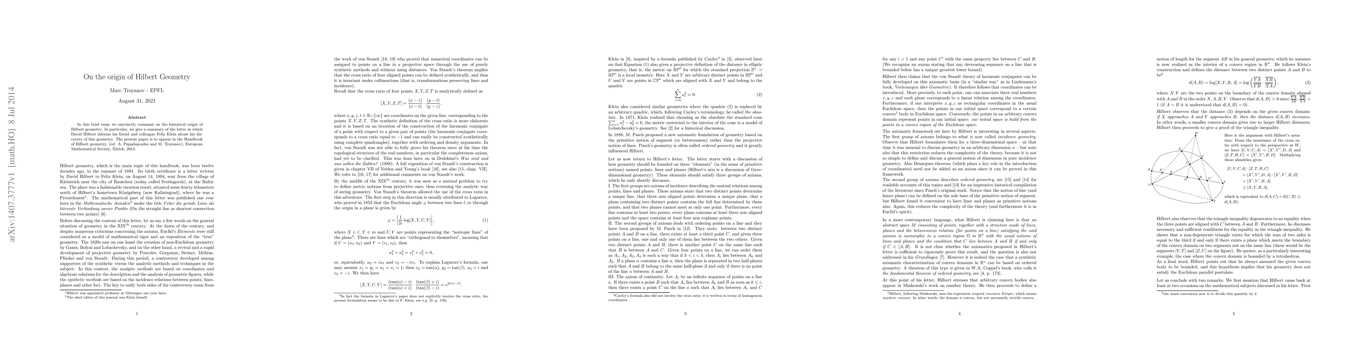 This paper provides a concise historical account of the origin of Hilbert geometry, focusing on a letter from David Hilbert to Felix Klein detailing his discovery. It is set to appear in the Handbook of Hilbert geometry, edited by A. Papadopoulos and M. Troyanov, published by the European Mathematical Society in 2014.