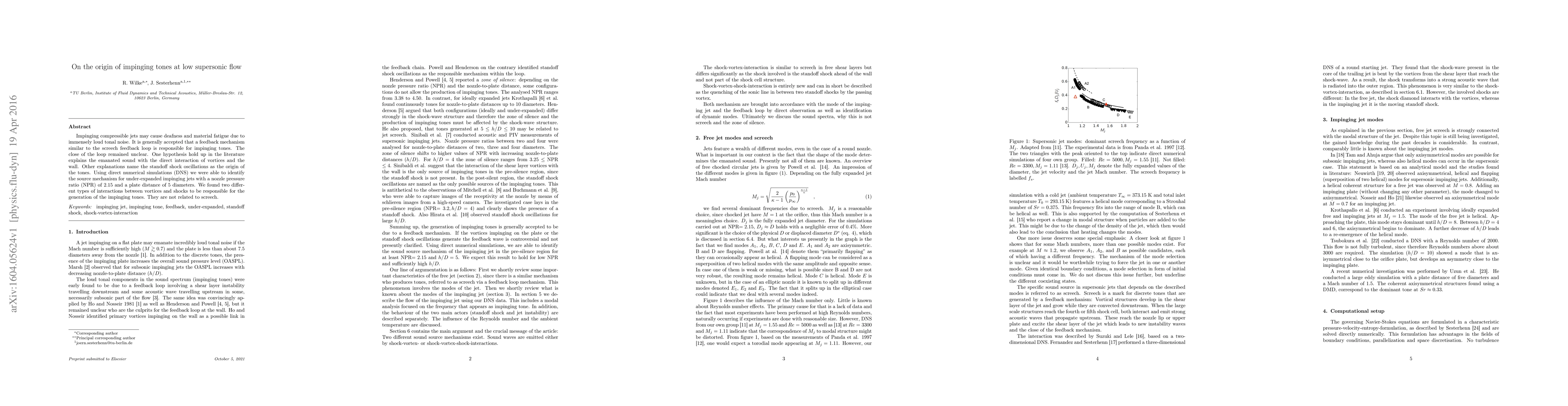 This research identifies the source mechanism for impinging tones in low supersonic flows using direct numerical simulations. It finds that two types of interactions between vortices and shocks generate the tones, distinguishing them from the screech feedback loop.