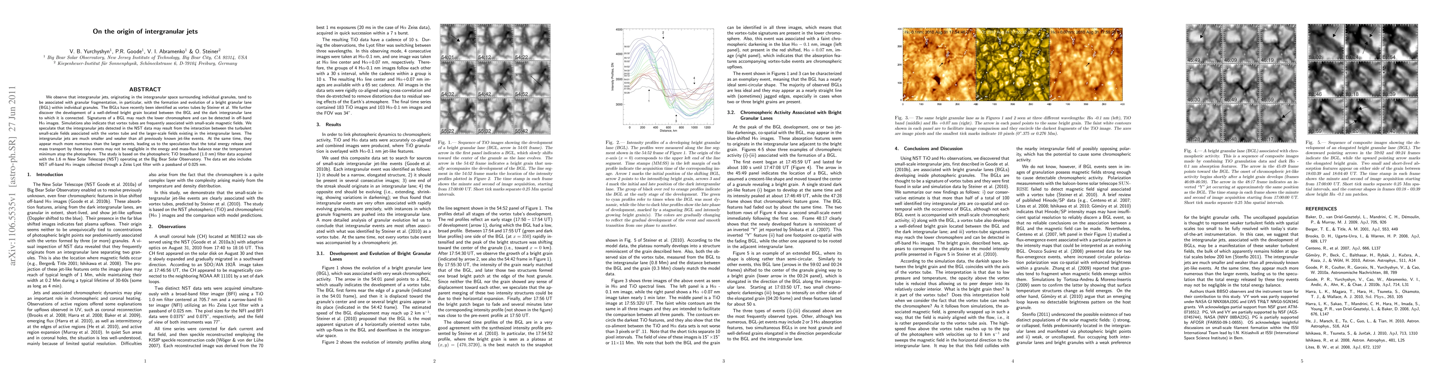 We observe that intergranular jets, originating in the intergranular space surrounding individual granules, tend to be associated with granular fragmentation, in particular, with the formation and evolution of a bright granular lane (BGL) within individual granules. The BGLs have recently been identified as vortex tubes by Steiner et al. We further discover the development of a well-defined bright grain located between the BGL and the dark intergranular lane to which it is connected. Signatures of a BGL may reach the lower chromosphere and can be detected in off-band \ha images. Simulations also indicate that vortex tubes are frequently associated with small-scale magnetic fields. We speculate that the intergranular jets detected in the NST data may result from the interaction between the turbulent small-scale fields associated with the vortex tube and the larger-scale fields existing in the intergranular lanes. The intergranular jets are much smaller and weaker than all previously known jet-like events. At the same time, they appear much more numerous than the larger events, leading us to the speculation that the total energy release and mass transport by these tiny events may not be negligible in the energy and mass-flux balance near the temperature minimum atop the photosphere. The study is based on the photospheric TiO broadband (1.0 nm) filter data acquired with the 1.6 m New Solar Telescope (NST) operating at the Big Bear Solar Observatory. The data set also includes NST off-band \ha images collected through a Zeiss Lyot filter with a passband of 0.025 nm.