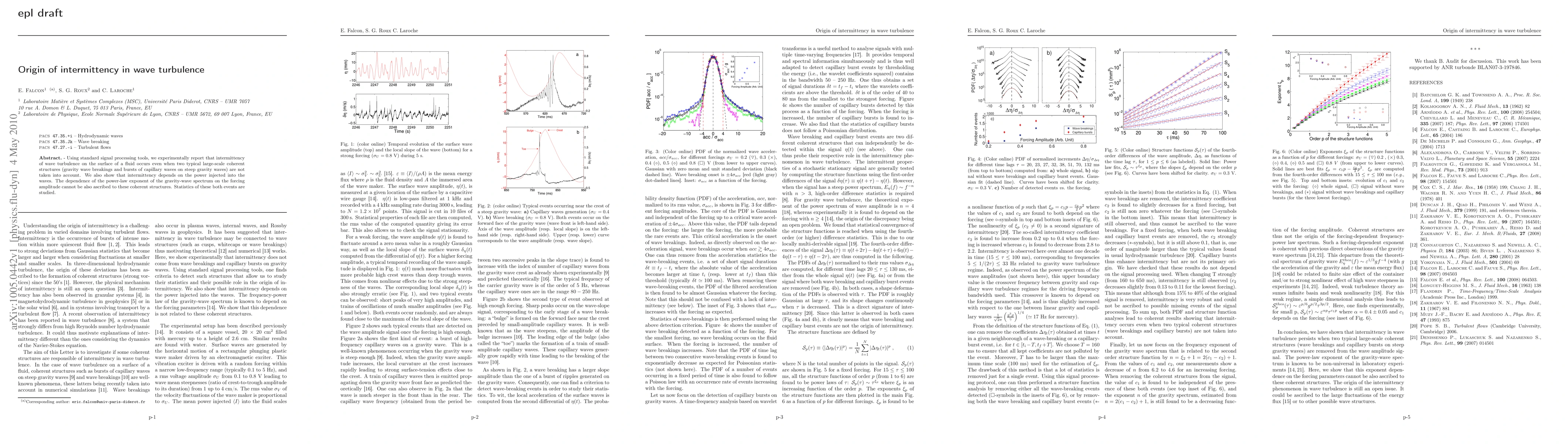 Using standard signal processing tools, we experimentally report that intermittency of wave turbulence on the surface of a fluid occurs even when two typical large-scale coherent structures (gravity wave breakings and bursts of capillary waves on steep gravity waves) are not taken into account. We also show that intermittency depends on the power injected into the waves. The dependence of the power-law exponent of the gravity-wave spectrum on the forcing amplitude cannot be also ascribed to these coherent structures. Statistics of these both events are studied.