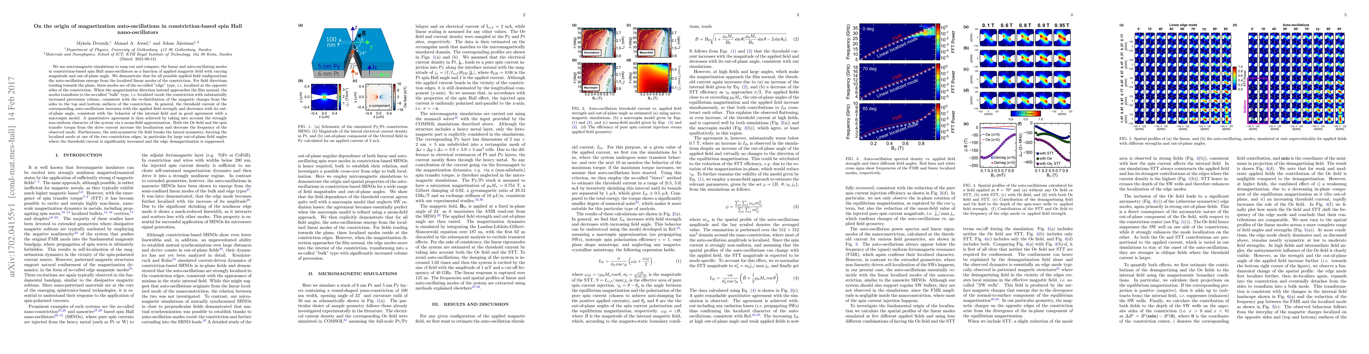This paper investigates magnetization auto-oscillations in constriction-based spin Hall nano-oscillators using micromagnetic simulations. It reveals that auto-oscillations originate from localized linear modes, transitioning from "edge" to "bulk" types with varying magnetic field angles, and correlates these findings with threshold current behavior and a mean-field model.