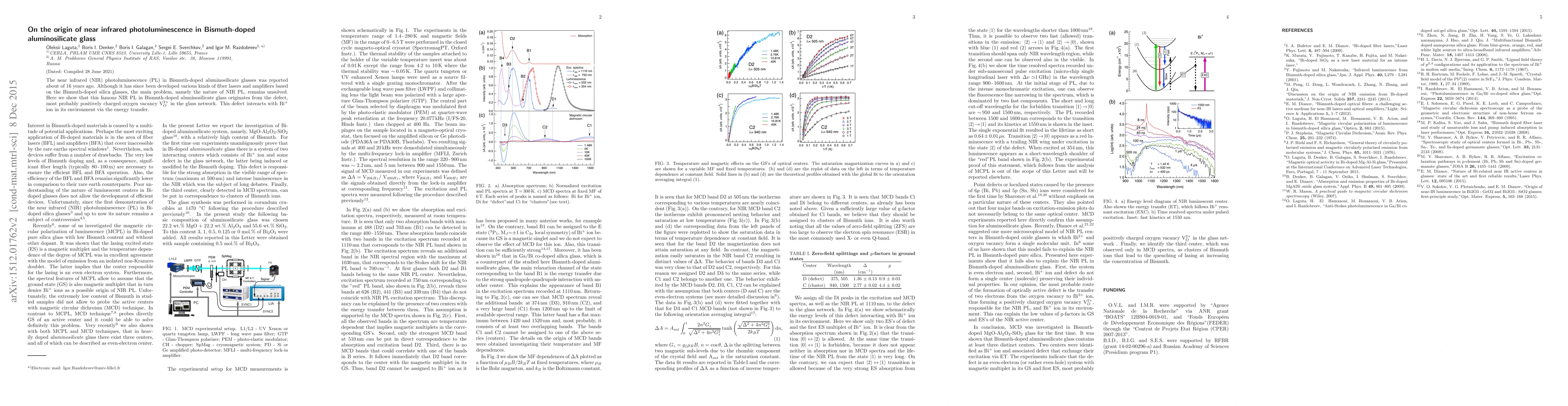 This paper identifies the origin of near infrared photoluminescence in Bismuth-doped aluminosilicate glass as positively charged oxygen vacancy defects, specifically V$_{O}^{2+}$, which interact with Bi$^+$ ions through energy transfer. The nature of this phenomenon, long unresolved, is now attributed to these defects.