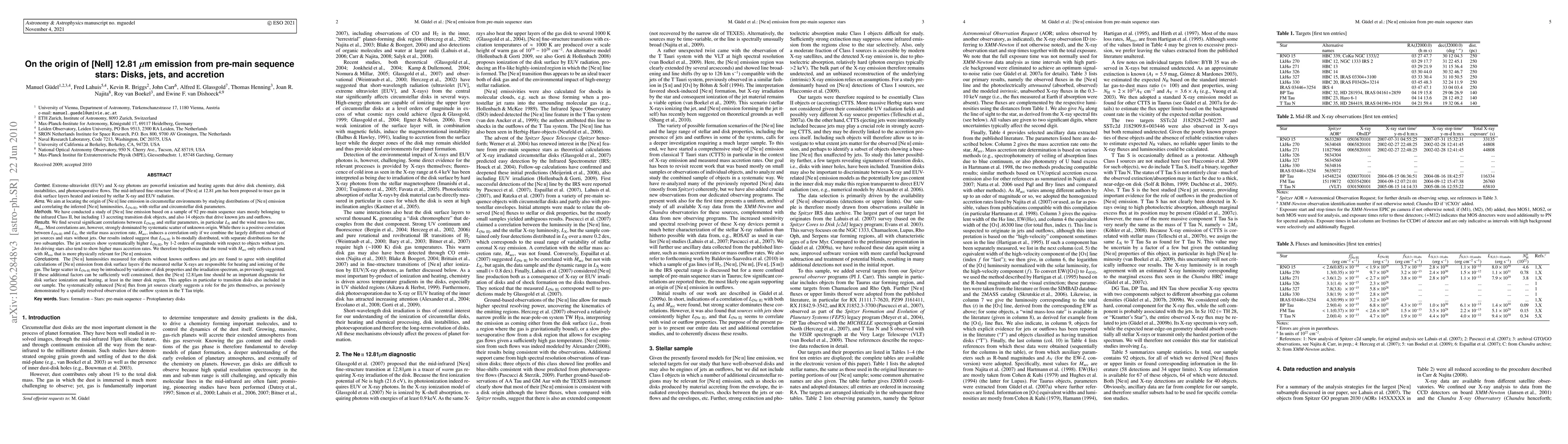 (Abridged) We have conducted a study of [NeII] line emission based on a sample of 92 pre-main sequence stars mostly belonging to the infrared Class II, including 13 accreting transition disk objects and 14 objects driving jets and outflows. We find several significant correlations between L[NeII] and stellar parameters, in particular LX and the wind mass loss rate, dM/dt. Most correlations are, however, strongly dominated by systematic scatter. While there is a positive correlation between L[NeII] and LX, the stellar mass accretion rate, dMacc/dt, induces a correlation only if we combine the largely different subsets of jet sources and stars without jets. Our results suggest that L[NeII] is bi-modally distributed, with separate distributions for the two subsamples. The jet sources show systematically higher L[NeII], by 1-2 orders of magnitude with respect to objects without jets. Jet-driving stars also tend to show higher mass accretion rates. We therefore hypothesize that the trend with dMacc/dt reflects a trend with dM/dt that is more physically relevant for [NeII] emission. L[NeII] measured for objects without known outflows and jets is found to agree with simplified calculations of [NeII] emission from disk surface layers if the measured stellar X-rays are responsible for heating and ionizing of the gas. The large scatter in L[NeII] may be introduced by variations of disk properties and the irradiation spectrum, as previously suggested. The systematically enhanced [NeII] flux from jet sources clearly suggests a role for the jets themselves, as previously demonstrated by a spatially resolved observation of the outflow system in the T Tau triple.