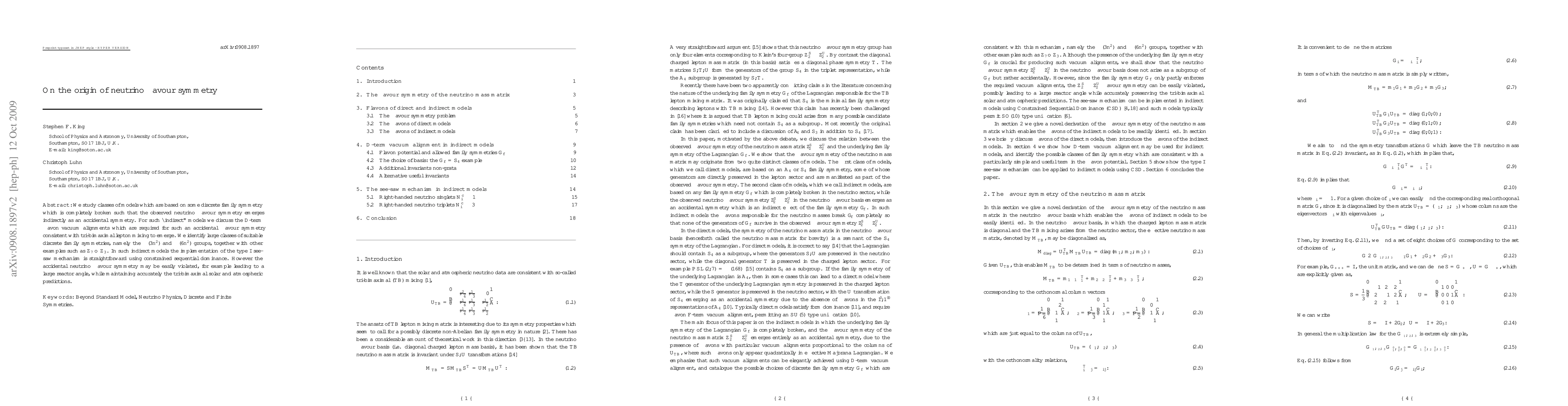 We study classes of models which are based on some discrete family symmetry which is completely broken such that the observed neutrino flavour symmetry emerges indirectly as an accidental symmetry. For such "indirect" models we discuss the D-term flavon vacuum alignments which are required for such an accidental flavour symmetry consistent with tri-bimaximal lepton mixing to emerge. We identify large classes of suitable discrete family symmetries, namely the $\Delta(3n^2)$ and $\Delta(6n^2)$ groups, together with other examples such as $Z_7\rtimes Z_3$. In such indirect models the implementation of the type I see-saw mechanism is straightforward using constrained sequential dominance. However the accidental neutrino flavour symmetry may be easily violated, for example leading to a large reactor angle, while maintaining accurately the tri-bimaximal solar and atmospheric predictions.