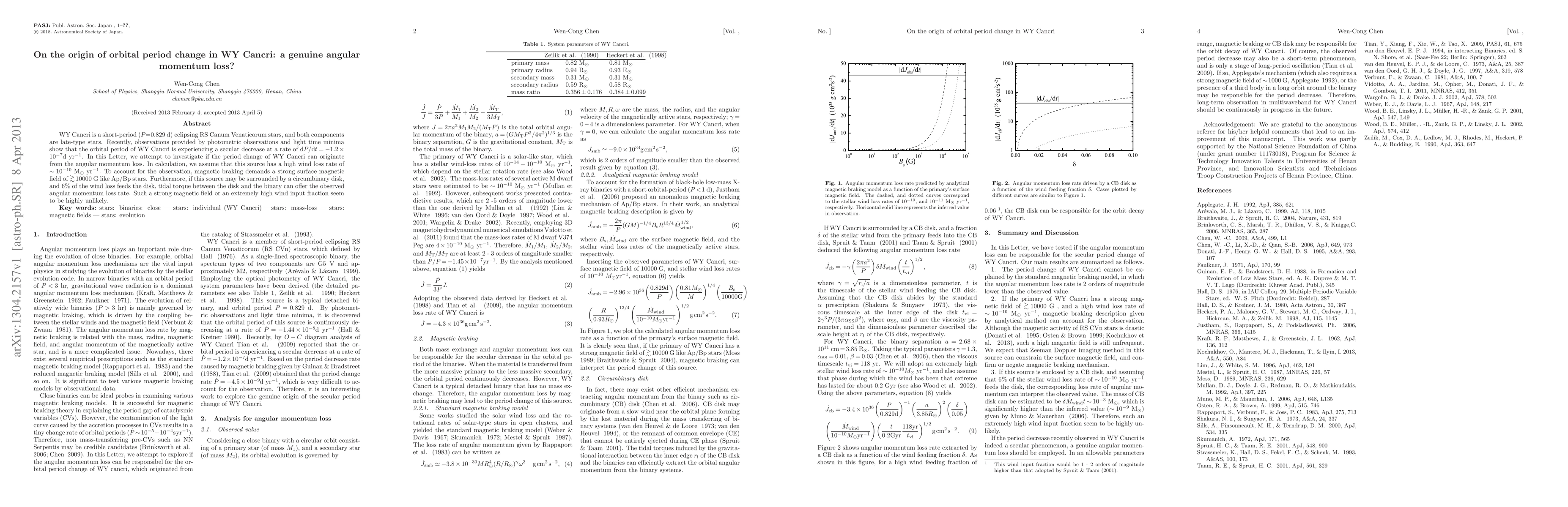 The paper presents an in-depth analysis of angular momentum loss in WY Cancri through magnetic braking and circumbinary disk mechanisms, providing a detailed comparison with observational data.