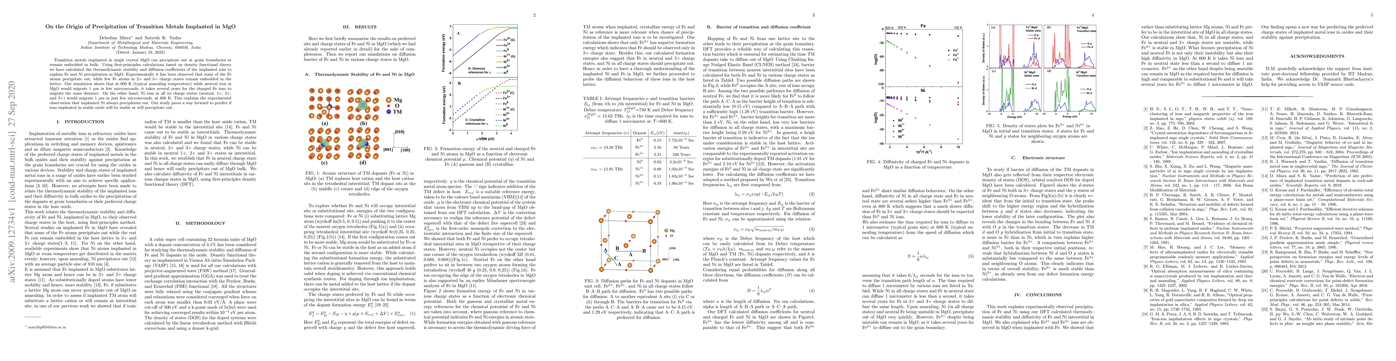 This paper uses first-principles calculations to determine the thermodynamic stability and diffusion of transition metals (Fe and Ni) implanted in MgO, explaining their differing behaviors: Fe precipitates while charged ions remain embedded, and Ni precipitates regardless of charge state. The study provides insights into predicting the behavior of implanted ions in stable oxides.
