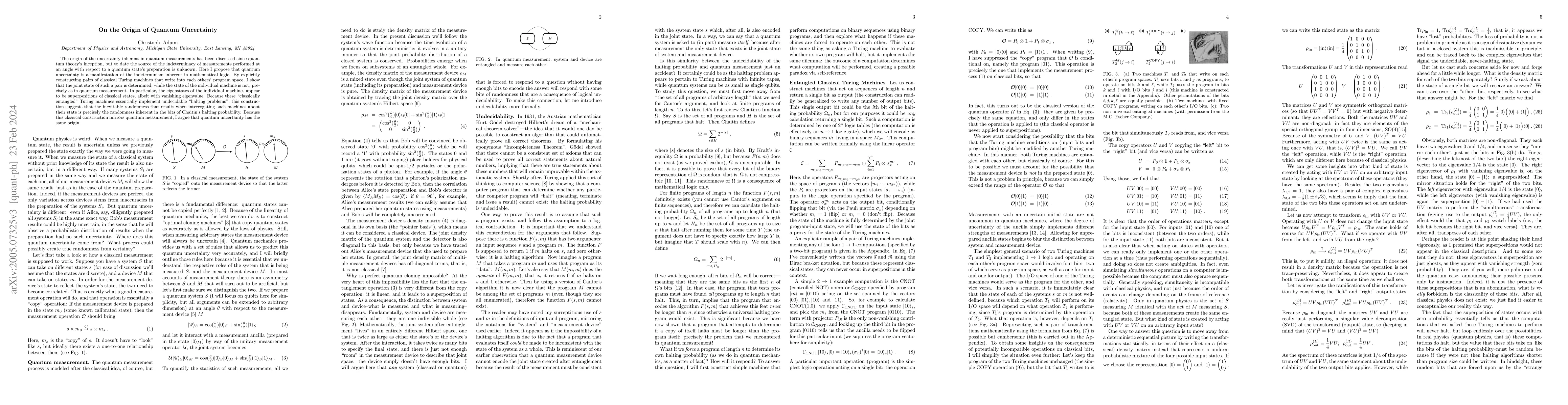 The origin of the uncertainty inherent in quantum measurements has been discussed since quantum theory's inception, but to date the source of the indeterminacy of measurements performed at an angle with respect to a quantum state's preparation is unknown. Here I propose that quantum uncertainty is a manifestation of the indeterminism inherent in mathematical logic. By explicitly constructing pairs of classical Turing machines that write into each others' program space, I show that the joint state of such a pair is determined, while the state of the individual machine is not, precisely as in quantum measurement. In particular, the eigenstates of the individual machines appear to be superpositions of classical states, albeit with vanishing eigenvalue. Because these "classically entangled" Turing machines essentially implement undecidable "halting problems", this construction suggests that the inevitable randomness that results when interrogating such machines about their state is precisely the randomness inherent in the bits of Chaitin's halting probability. Because this classical construction mirrors quantum measurement, I argue that quantum uncertainty has the same origin.