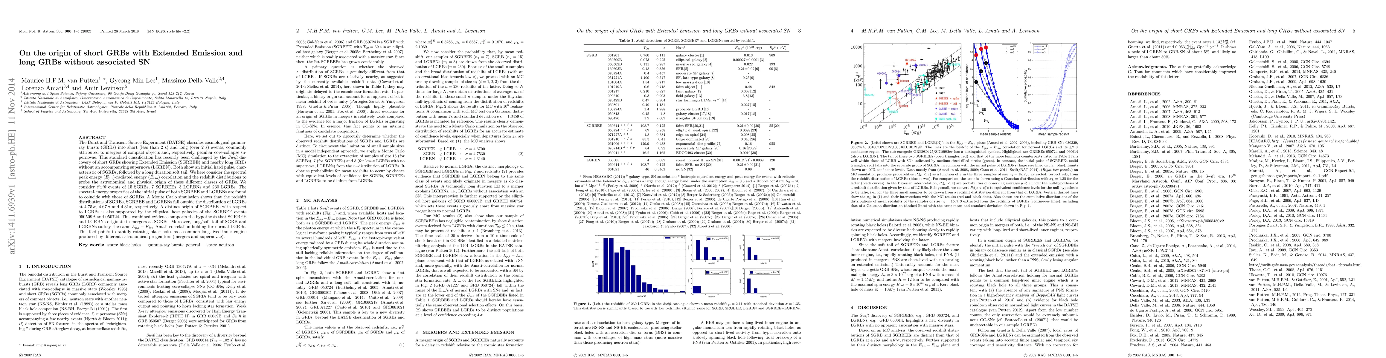The Burst and Transient Source Experiment (BATSE) classifies cosmological gamma-ray bursts (GRBs) into short (less than 2 s) and long (over 2 s) events, commonly attributed to mergers of compact objects and, respectively, peculiar core-collapse supernovae. This standard classification has recently been challenged by the {\em Swift} discovery of short GRBs showing Extended Emission (SGRBEE) and nearby long GRBs without an accompanying supernova (LGRBN). Both show an initial hard pulse, characteristic of SGRBs, followed by a long duration soft tail. We here consider the spectral peak energy ($E_{p,i}$)-radiated energy $(E_{iso})$ correlation and the redshift distributions to probe the astronomical and physical origin of these different classes of GRBs. We consider {\em Swift} events of $15$ SGRBs, $7$ SGRBEEs, 3 LGRBNs and 230 LGRBs. The spectral-energy properties of the initial pulse of both SGRBEE and LGRBNs are found to coincide with those of SGRBs. A Monte Carlo simulation shows that the redshift distributions of SGRBs, SGRBEE and LGRBNs fall outside the distribution of LGRBs at 4.75$\,\sigma$, 4.67$\,\sigma$ and 4.31$\sigma$, respectively. A distinct origin of SGRBEEs with respect to LGRBs is also supported by the elliptical host galaxies of the SGRBEE events 050509B and 050724. This combined evidence supports the hypothesis that SGRBEE and LGRBNs originate in mergers as SGRBs. Moreover, long/soft tail of SGRB and LGRBNs satisfy the same $E_{p,i}-E_{iso}$ Amati-correlation holding for normal LGRBs. This fact points to rapidly rotating black holes as a common long-lived inner engine produced by different astronomical progenitors (mergers and supernovae).