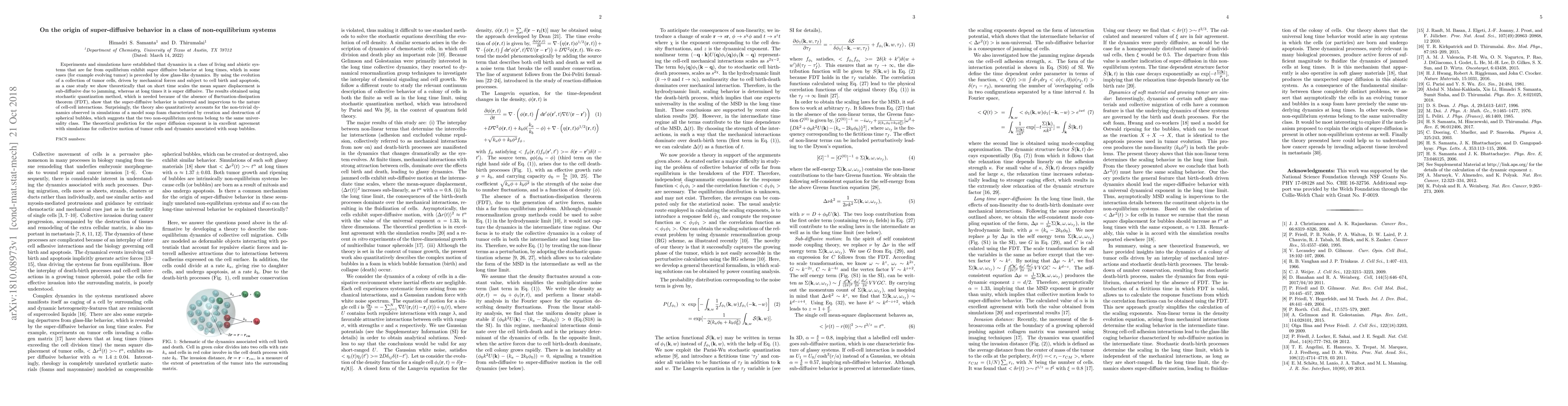 This paper investigates the origin of super-diffusive behavior in non-equilibrium systems, demonstrating that short-time sub-diffusive dynamics due to jamming transitions to long-time super-diffusive behavior. Theoretical results using stochastic quantization show that this behavior is universal and applies to both tumor cell dynamics and soap foam bubble dynamics, suggesting they belong to the same universality class.