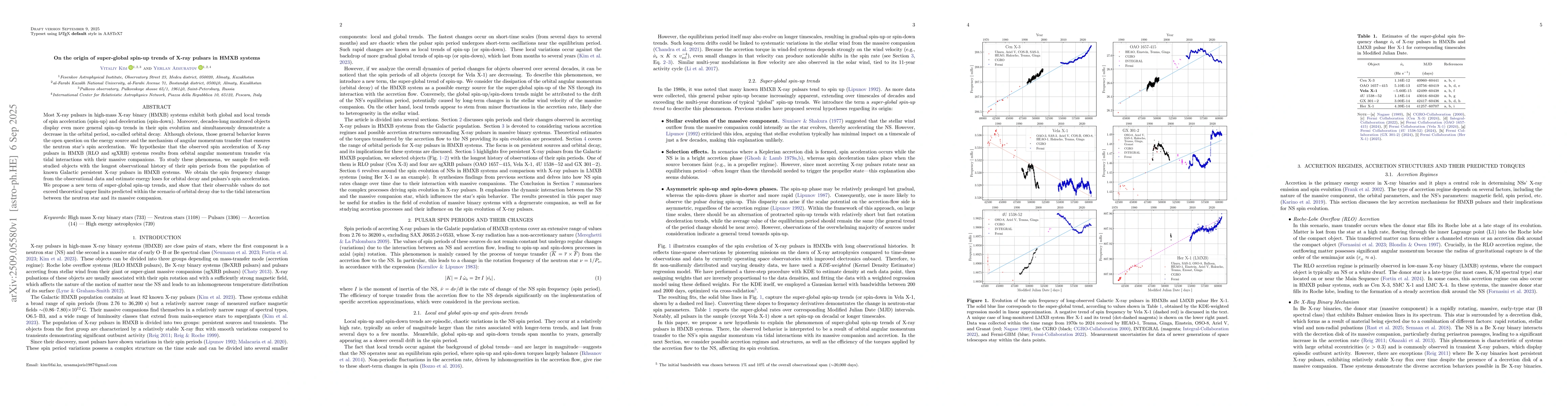 Most X-ray pulsars in high-mass X-ray binary (HMXB) systems exhibit both global and local trends of spin acceleration (spin-up) and deceleration (spin-down). Moreover, decades-long monitored objects display even more general spin-up trends in their spin evolution and simultaneously demonstrate a decrease in the orbital period, so-called orbital decay. Although obvious, this general behavior leaves the open question of the energy source and the mechanism of angular momentum transfer that ensures the neutron star's spin acceleration. We hypothesize that the observed spin acceleration of X-ray pulsars in HMXB (RLO and sgXRB) systems results from orbital angular momentum transfer via tidal interactions with their massive companions. To study these phenomena, we sample five well-studied objects with the longest observational history of their spin periods from the population of known Galactic persistent X-ray pulsars in HMXB systems. We obtain the spin frequency change from the observational data and estimate energy losses for orbital decay and pulsars' spin acceleration. We propose a new term of super-global spin-up trends, and show that their observable values do not exceed theoretical upper limits predicted within the scenario of orbital decay due to the tidal interaction between the neutron star and its massive companion.