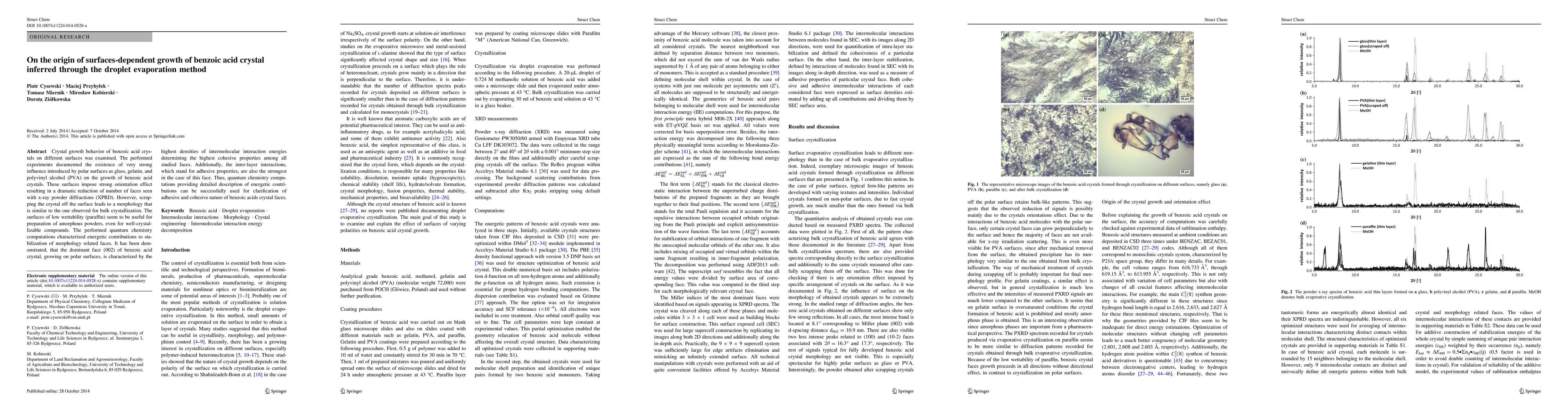 This study investigates the influence of different surfaces on the growth of benzoic acid crystals, revealing that polar surfaces like glass and gelatin significantly alter crystal morphology by reducing the number of observable faces. Quantum chemistry computations show that the dominant face (002) has the highest intermolecular interaction energies, explaining its strong cohesive and adhesive properties.
