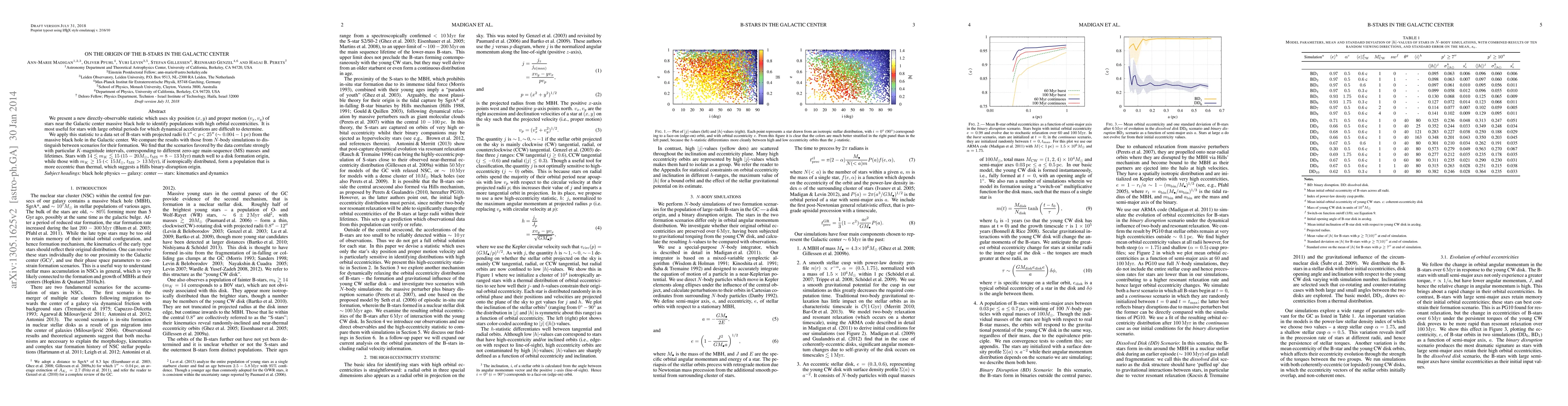 We present a new directly-observable statistic which uses sky position and proper motion of stars near the Galactic center massive black hole to identify populations with high orbital eccentricities. It is most useful for stars with large orbital periods for which dynamical accelerations are difficult to determine. We apply this statistic to a data set of B-stars with projected radii 0."1 < p < 25" (~0.004 - 1 pc) from the massive black hole in the Galactic center. We compare the results with those from N-body simulations to distinguish between scenarios for their formation. We find that the scenarios favored by the data correlate strongly with particular K-magnitude intervals, corresponding to different zero-age main-sequence (MS) masses and lifetimes. Stars with 14 < mK < 15 (15 - 20 solar masses, t_{MS} = 8-13 Myr) match well to a disk formation origin, while those with mK > 15 (<15 solar masses, t_{MS} >13 Myr), if isotropically distributed, form a population that is more eccentric than thermal, which suggests a Hills binary-disruption origin.