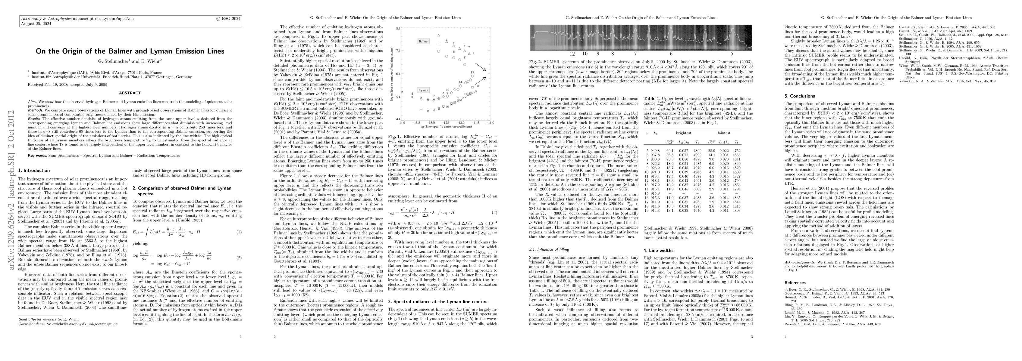 This paper investigates the differences in hydrogen Balmer and Lyman emission lines from quiescent solar prominences, revealing significant discrepancies in effective hydrogen atom densities contributing to each series, which diminish with higher energy levels. The distinct spatial origins and differing brightness temperatures for the lines suggest unique physical processes for the Balmer and Lyman emissions.