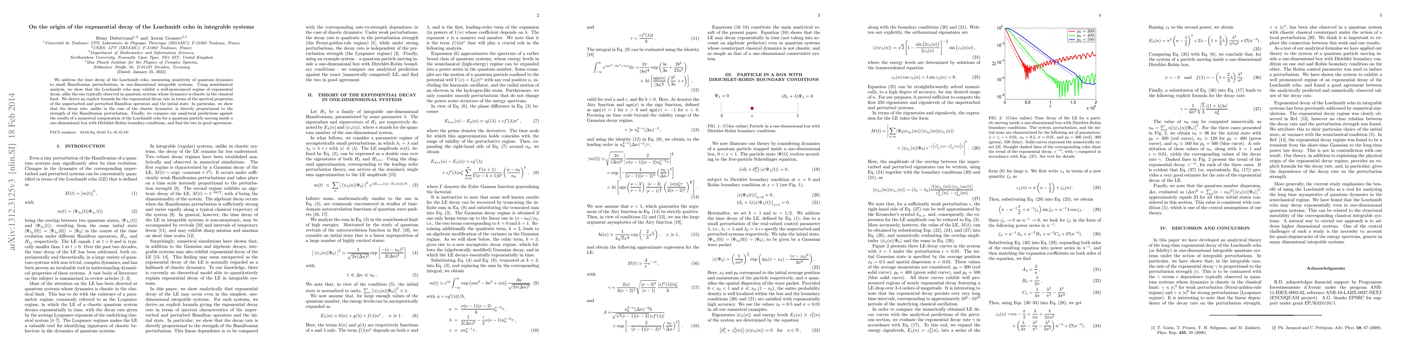 This paper investigates the exponential decay of the Loschmidt echo in one-dimensional integrable quantum systems, revealing that it can exhibit decay similar to chaotic systems. The authors derive an explicit formula for the decay rate, showing it is proportional to the perturbation strength, and validate their findings through numerical simulations.