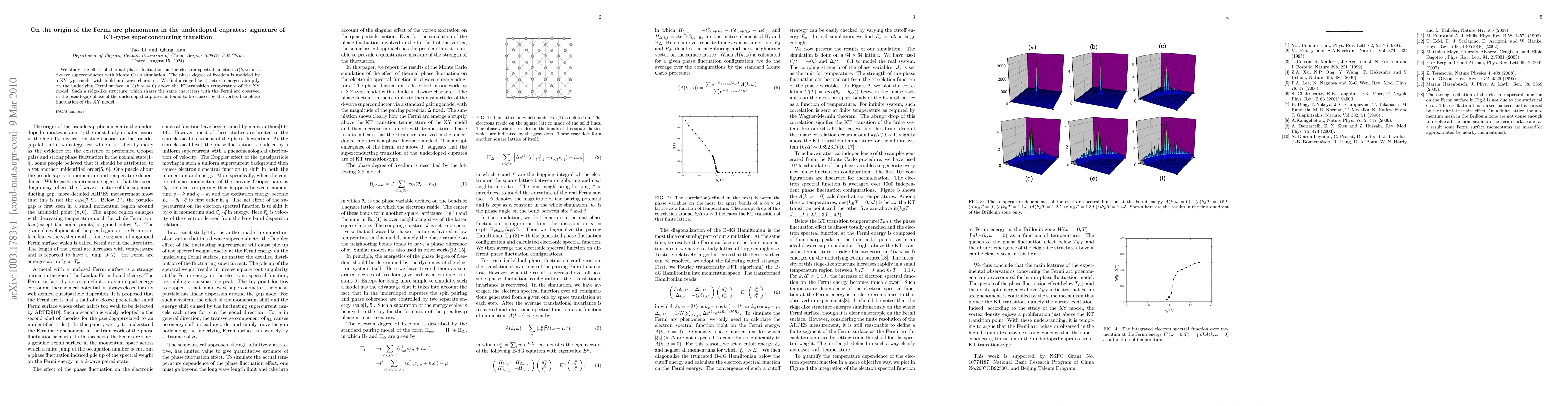 We study the effect of thermal phase fluctuation on the electron spectral function $A(k,\omega)$ in a d-wave superconductor with Monte Carlo simulation. The phase degree of freedom is modeled by a XY-type model with build-in d-wave character. We find a ridge-like structure emerges abruptly on the underlying Fermi surface in $A(k,\omega=0)$ above the KT-transition temperature of the XY model. Such a ridge-like structure, which shares the same characters with the Fermi arc observed in the pseudogap phase of the underdoped cuprates, is found to be caused by the vortex-like phase fluctuation of the XY model.