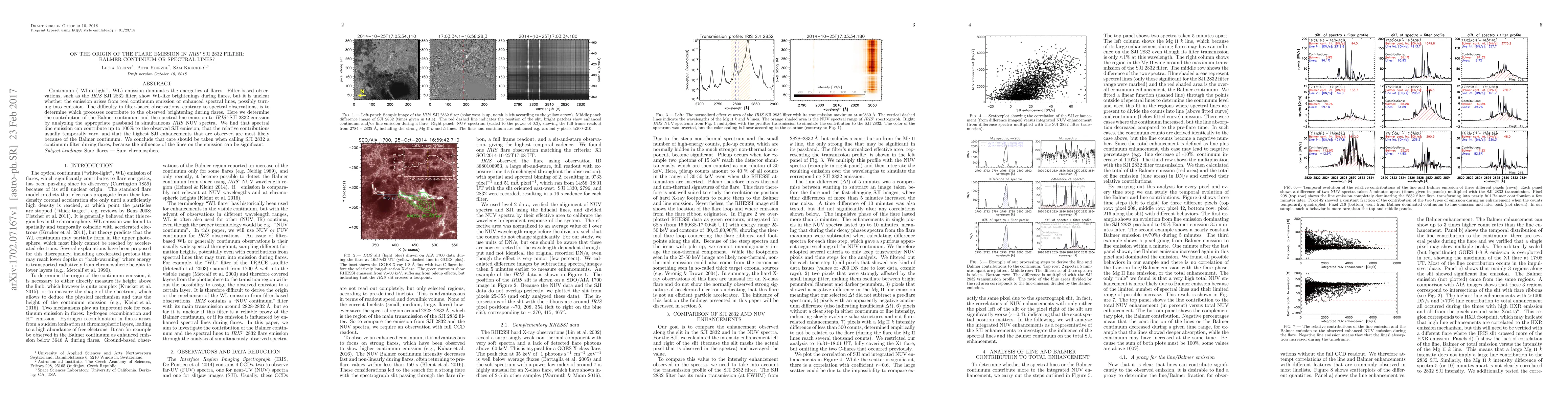 Continuum ("White-light", WL) emission dominates the energetics of flares. Filter-based observations, such as the IRIS SJI 2832 filter, show WL-like brightenings during flares, but it is unclear whether the emission arises from real continuum emission or enhanced spectral lines, possibly turning into emission. The difficulty in filter-based observations, contrary to spectral observations, is to determine which processes contribute to the observed brightening during flares. Here we determine the contribution of the Balmer continuum and the spectral line emission to IRIS' SJI 2832 emission by analyzing the appropriate passband in simultaneous IRIS NUV spectra. We find that spectral line emission can contribute up to 100% to the observed SJI emission, that the relative contributions usually temporally vary, and that the highest SJI enhancements that are observed are most likely because of the Balmer continuum. We conclude that care should be taken when calling SJI 2832 a continuum filter during flares, because the influence of the lines on the emission can be significant.