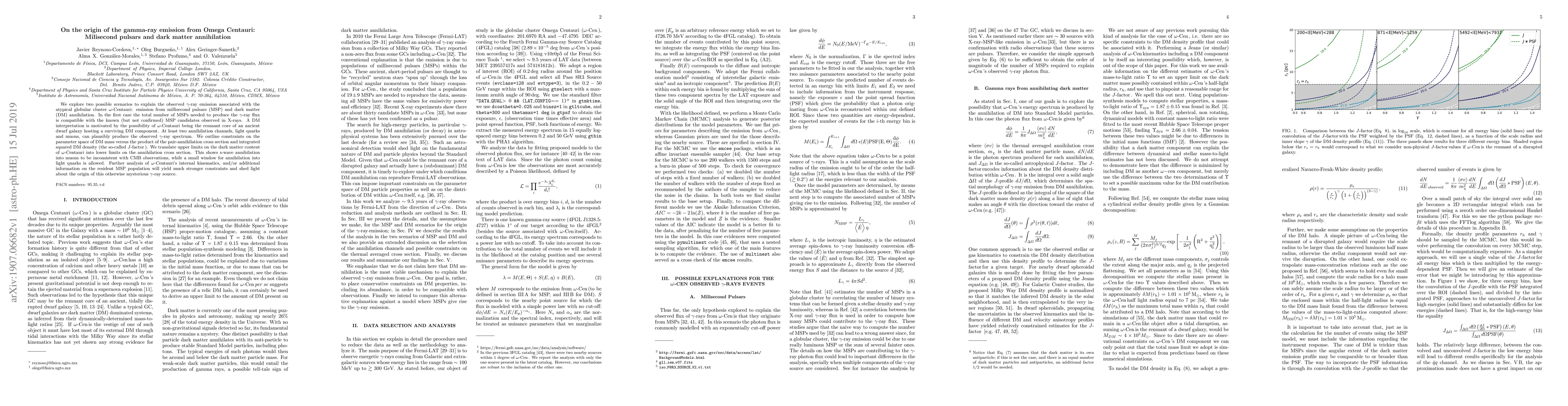 This paper explores the gamma-ray emission from Omega Centauri, considering both millisecond pulsars and dark matter annihilation as potential sources. It finds that while pulsars could explain the emission, dark matter annihilation, particularly into light quarks, remains a plausible, albeit constrained, possibility.