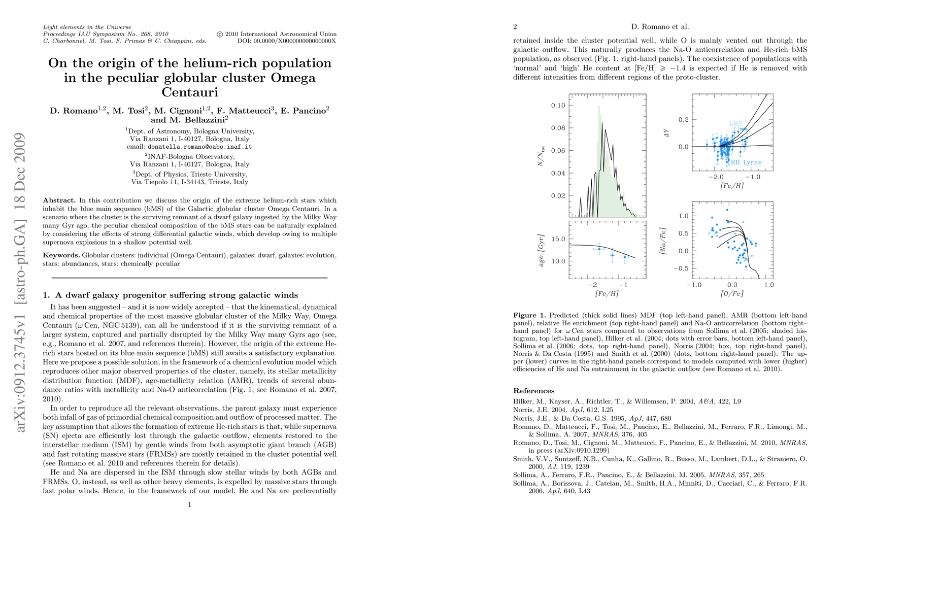 Summary: This paper explores the origin of helium-rich stars in Omega Centauri, suggesting they result from the cluster's past as a dwarf galaxy that merged with the Milky Way, with their unique composition explained by differential galactic winds from supernovae.