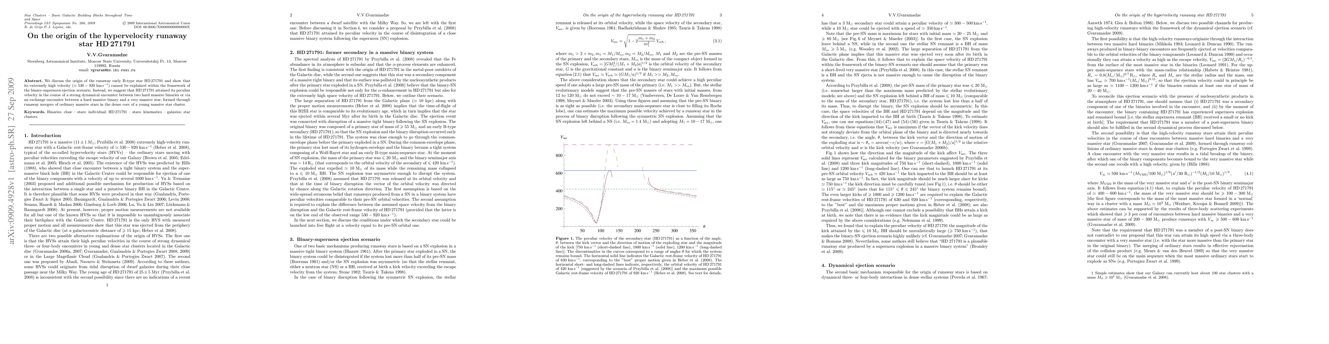 The paper explores the origin of the hypervelocity star HD271791, concluding that its high velocity cannot be explained by binary-supernova ejection. Instead, it proposes that the star's velocity resulted from a dynamical encounter in a dense young star cluster.