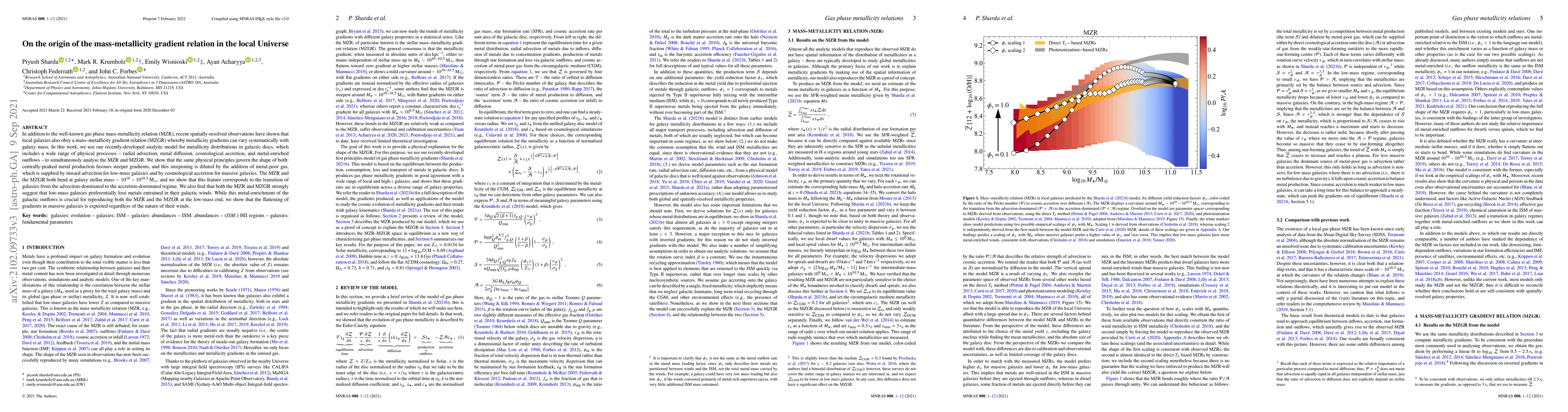 This paper investigates the mass-metallicity gradient relation (MZGR) in local galaxies, using an analytic model that incorporates radial advection, metal diffusion, cosmological accretion, and metal-enriched outflows. The study finds that both the mass-metallicity relation (MZR) and MZGR are governed by the same physical principles, with metal production and gas supply influencing metallicity gradients.