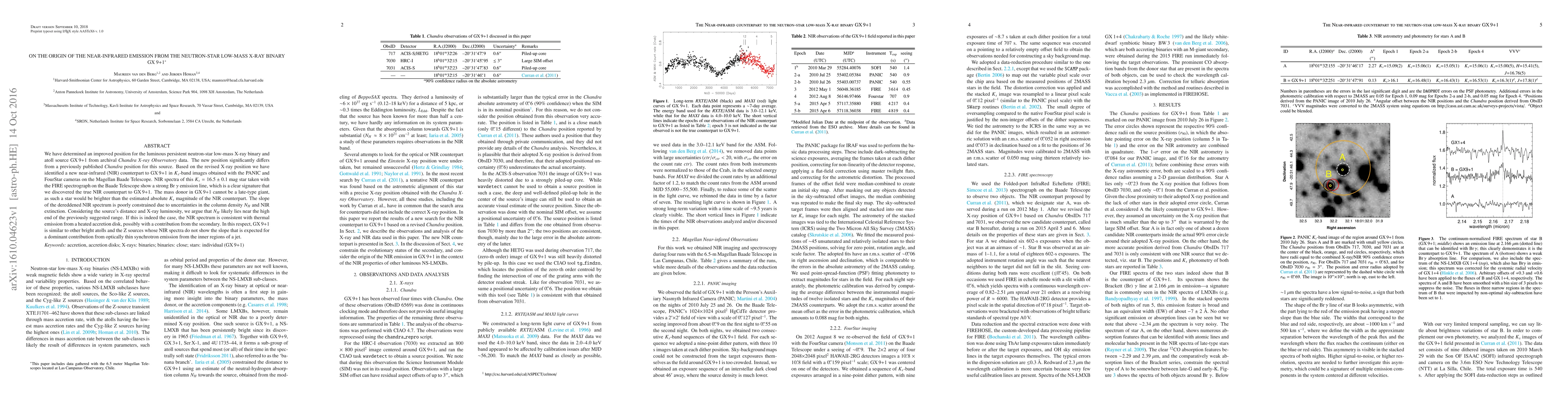 We have determined an improved position for the luminous persistent neutron-star low-mass X-ray binary and atoll source GX 9+1 from archival Chandra X-ray Observatory data. The new position significantly differs from a previously published Chandra position for this source. Based on the revised X-ray position we have identified a new near-infrared (NIR) counterpart to GX 9+1 in Ks-band images obtained with the PANIC and FourStar cameras on the Magellan Baade Telescope. NIR spectra of this Ks=16.5+-0.1 mag star taken with the FIRE spectrograph on the Baade Telescope show a strong Br-gamma emission line, which is a clear signature that we discovered the true NIR counterpart to GX 9+1. The mass donor in GX 9+1 cannot be a late-type giant, as such a star would be brighter than the estimated absolute Ks magnitude of the NIR counterpart. The slope of the dereddened NIR spectrum is poorly constrained due to uncertainties in the column density N_H and NIR extinction. Considering the source's distance and X-ray luminosity, we argue that N_H likely lies near the high end of the previously suggested range. If this is indeed the case, the NIR spectrum is consistent with thermal emission from a heated accretion disk, possibly with a contribution from the secondary. In this respect, GX 9+1 is similar to other bright atolls and the Z sources whose NIR spectra do not show the slope that is expected for a dominant contribution from optically thin synchrotron emission from the inner regions of a jet.