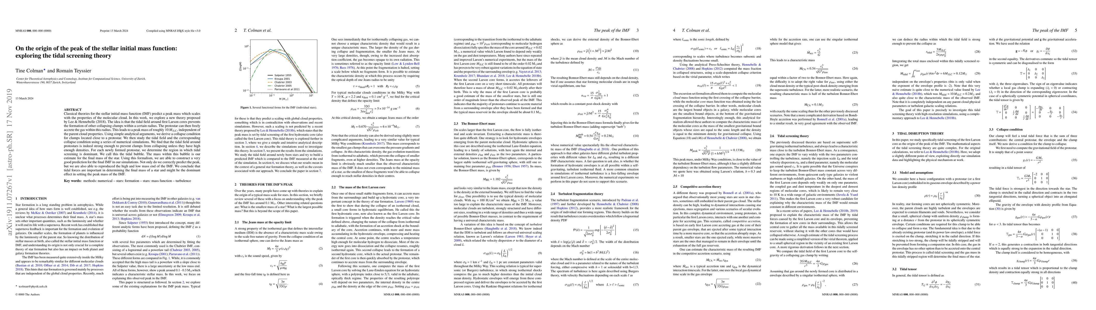 Classical theories for the stellar initial mass function (IMF) predict a peak mass which scales with the properties of the molecular cloud. In this work, we explore a new theory proposed by Lee & Hennebelle (2018). The idea is that the tidal field around first Larson cores prevents the formation of other collapsing clumps within a certain radius. The protostar can then freely accrete the gas within this radius. This leads to a peak mass of roughly $10 \, M_{\mathrm{1LC}}$, independent of the parent cloud properties. Using simple analytical arguments, we derive a collapse condition for clumps located close to a protostar. We then study the tidal field and the corresponding collapse condition using a series of numerical simulations. We find that the tidal field around protostars is indeed strong enough to prevent clumps from collapsing unless they have high enough densities. For each newly formed protostar, we determine the region in which tidal screening is dominant. We call this the tidal bubble. The mass within this bubble is our estimate for the final mass of the star. Using this formalism, we are able to construct a very good prediction for the final IMF in our simulations. Not only do we correctly predict the peak, but we are also able to reproduced the high and low mass end of the IMF. We conclude that tidal forces are important in determining the final mass of a star and might be the dominant effect in setting the peak mass of the IMF.