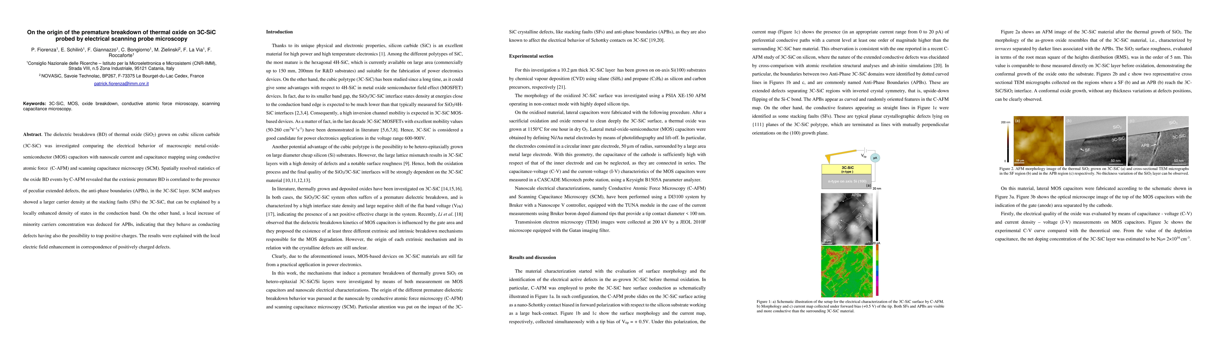 This paper investigates the premature breakdown of thermal oxide on 3C-SiC using electrical scanning probe microscopy, revealing that breakdown is correlated with anti-phase boundaries in the 3C-SiC layer, which act as conducting defects and trap positive charges due to local electric field enhancement.