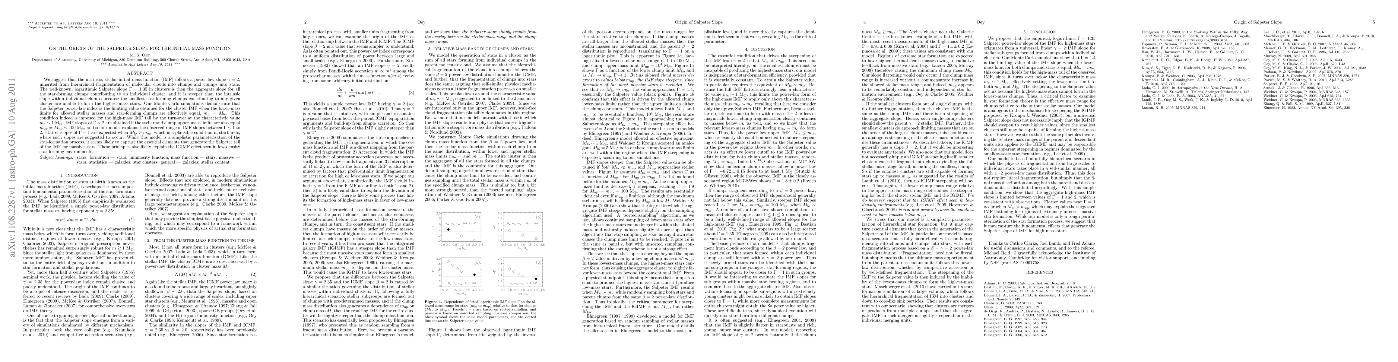We suggest that the intrinsic, stellar initial mass function (IMF) follows a power-law slope gamma=2, inherited from hierarchical fragmentation of molecular clouds into clumps and clumps into stars. The well-known, logarithmic Salpeter slope GAMMA=1.35 in clusters is then the aggregate slope for all the star-forming clumps contributing to an individual cluster, and it is steeper than the intrinsic slope within individual clumps because the smallest star-forming clumps contributing to any given cluster are unable to form the highest-mass stars. Our Monte Carlo simulations demonstrate that the Salpeter power-law index is the limiting value obtained for the cluster IMF when the lower-mass limits for allowed stellar masses and star-forming clumps are effectively equal, m_lo = M_lo. This condition indeed is imposed for the high-mass IMF tail by the turn-over at the characteristic value m_c ~ 1 M_sun. IMF slopes of GAMMA ~ 2 are obtained if the stellar and clump upper-mass limits are also equal m_up = M_up ~ 100 M_sun, and so our model explains the observed range of IMF slopes between GAMMA ~ 1 to 2. Flatter slopes of GAMMA = 1 are expected when M_lo > m_up, which is a plausible condition in starbursts, where such slopes are suggested to occur. While this model is a simplistic parameterization of the star-formation process, it seems likely to capture the essential elements that generate the Salpeter tail of the IMF for massive stars. These principles also likely explain the IGIMF effect seen in low-density star-forming environments.