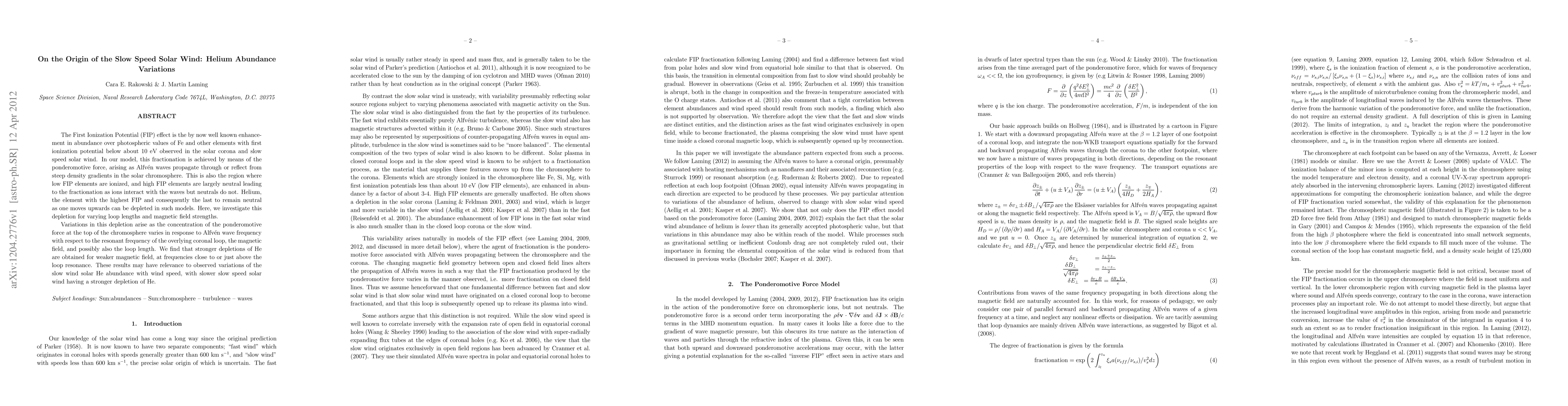 This paper explores the FIP effect in the slow speed solar wind, focusing on the depletion of helium due to Alfvén wave interactions in the solar chromosphere. The study finds that weaker magnetic fields and frequencies near the loop resonance lead to stronger helium depletion, potentially explaining observed variations in helium abundance in the slow solar wind.