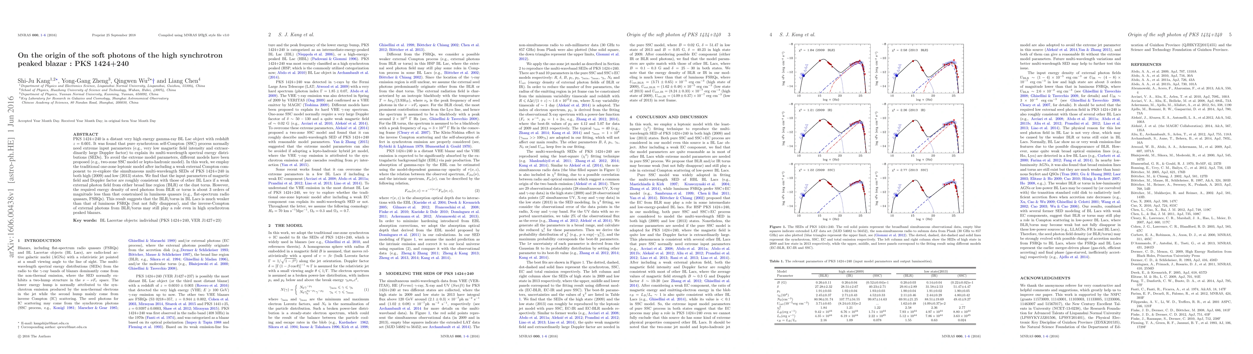 This study re-examines the multi-wavelength spectral energy distributions of the blazar PKS 1424+240 using a one-zone leptonic model with an external Compton component. The findings suggest that the required energy density of seed photons from the broad line region or torus is significantly lower than in luminous quasars, implying a weaker BLR/torus in BL Lacs compared to FSRQs, and that external Compton scattering of photons from BLR/torus may still influence high synchrotron peaked blazars.
