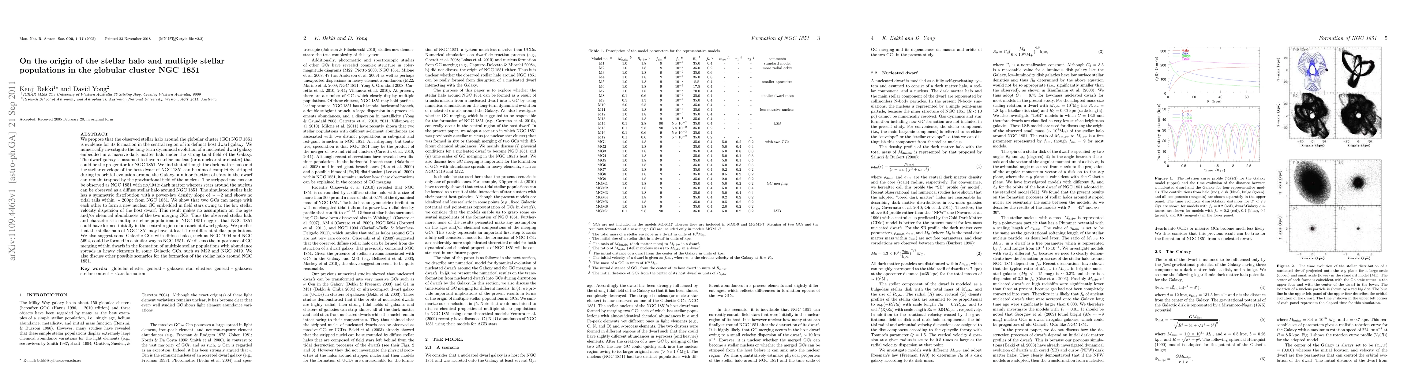 This paper proposes that the stellar halo around NGC 1851 formed from the remnants of a defunct host dwarf galaxy, with the cluster itself originating from the nucleus of this dwarf. The study finds that merging globular clusters and the stripping of the dwarf galaxy's dark matter halo can explain the observed stellar halo and multiple stellar populations in NGC 1851.