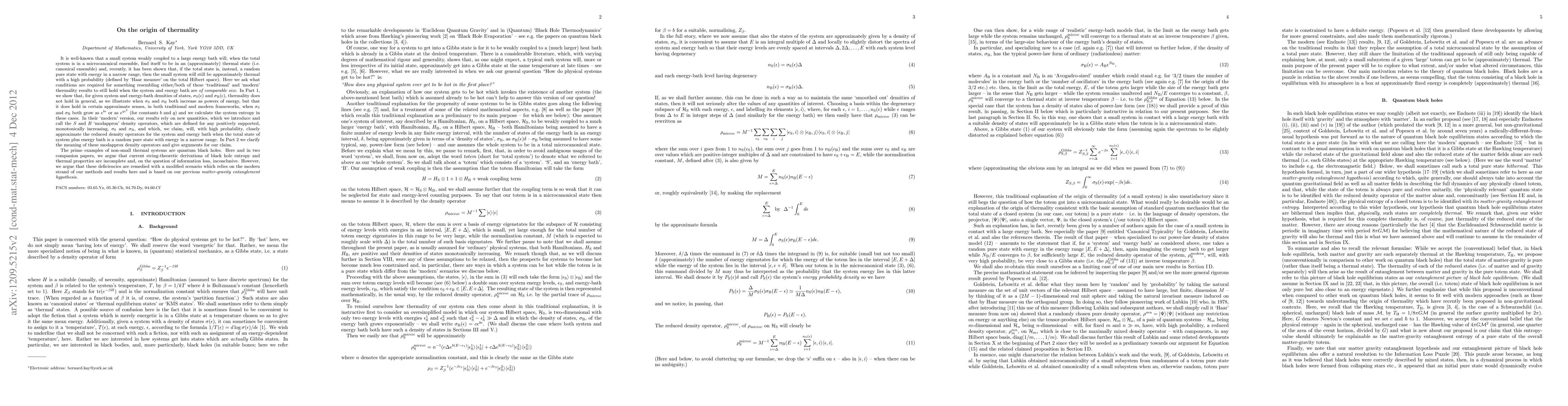 It is well-known that a small system weakly coupled to a large energy bath in a total microcanonical ensemble will find itself in an (approximately) thermal state and, recently, it has been shown that, if the total state is, instead, a random pure state with energy in a narrow range, then the small system will still be approximately thermal with a high probability (wrt `Haar measure'). We ask what conditions are required for something resembling these 'traditional' and 'modern' thermality results to still hold when system and energy bath are of comparable size. In Part 1, we show that, for given system and energy-bath densities of states, s_S(e) and s_B(e), thermality does not hold in general, as we illustrate when both increase as powers of energy, but that it does hold in certain approximate senses, in both traditional and modern frameworks, when both grow as exp(be) or as exp(qe^2) and we calculate the system entropy in these cases. In their 'modern' version, our results rely on new quantities, which we introduce and call the S and B 'modapprox' density operators, which, we claim, will, with high probability, give a close approximation to the reduced density operator for the system and energy bath when the total state of system plus energy bath is a random pure state with energy in a narrow range. In Part 2 we clarify the meaning of these modapprox density operators and give arguments for our claim. The prime examples of non-small thermal systems are quantum black holes. Here and in two companion papers, we argue that current string-theoretic derivations of black hole entropy and thermal properties are incomplete and, on the question of information loss, inconclusive. However, we argue that these deficiencies are remedied with a modified scenario which relies on the modern strand of our methods and results here and is based on our previous 'matter-gravity entanglement hypothesis'.