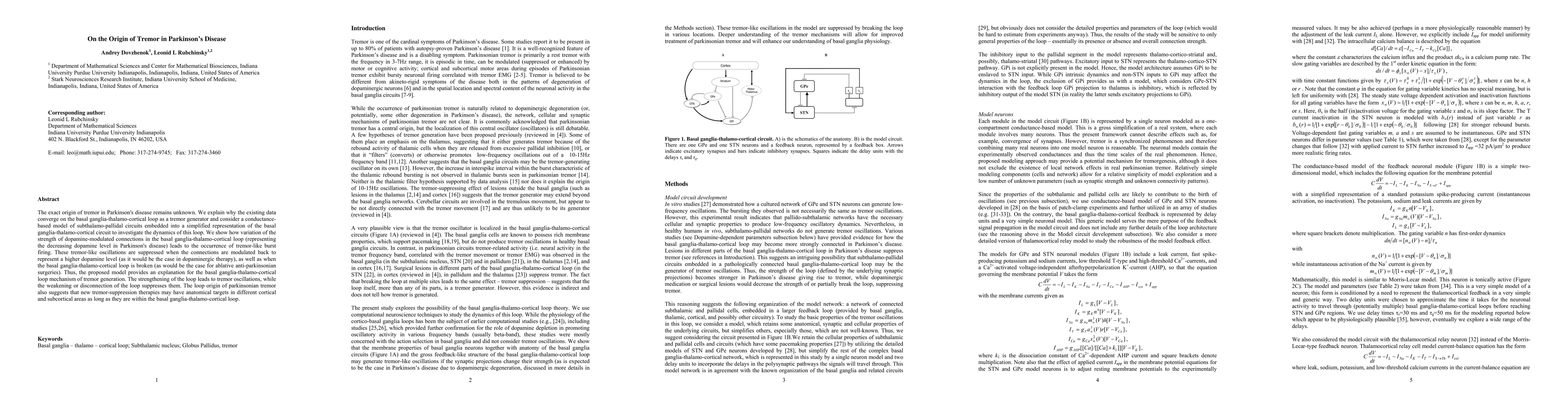 This paper proposes that the basal ganglia-thalamo-cortical loop is the origin of tremor in Parkinson's disease, demonstrating through a conductance-based model that decreased dopamine levels strengthen this loop, leading to tremor-like oscillations, which are suppressed by increased dopamine or loop disruption.