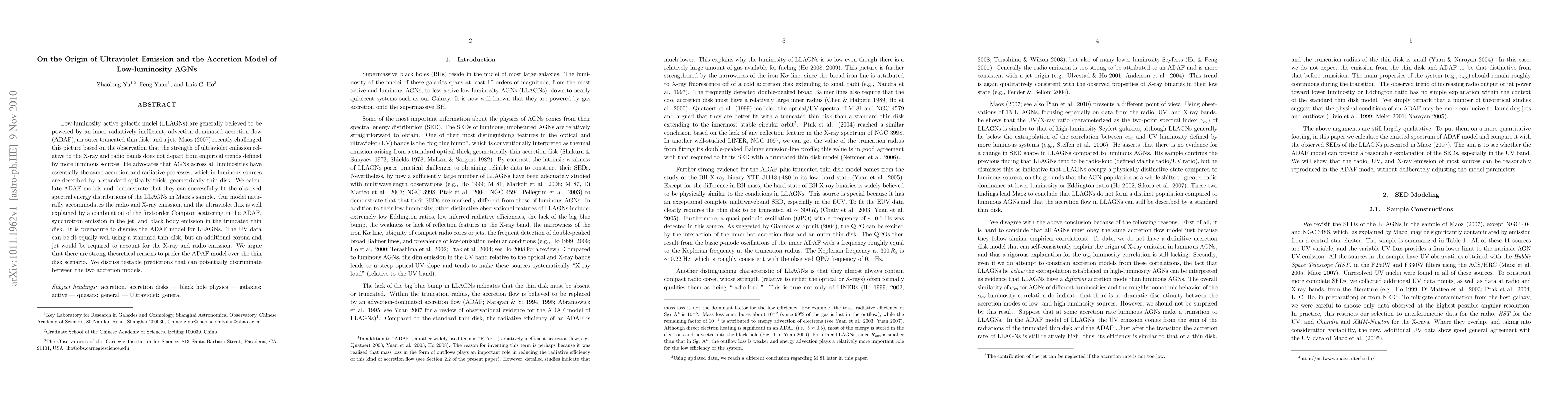 Low-luminosity active galactic nuclei (LLAGNs) are generally believed to be powered by an inner radiatively inefficient, advection-dominated accretion flow (ADAF), an outer truncated thin disk, and a jet. Maoz (2007) recently challenged this picture based on the observation that the strength of ultraviolet emission relative to the X-ray and radio bands does not depart from empirical trends defined by more luminous sources. He advocates that AGNs across all luminosities have essentially the same accretion and radiative processes, which in luminous sources are described by a standard optically thick, geometrically thin disk. We calculate ADAF models and demonstrate that they can successfully fit the observed spectral energy distributions of the LLAGNs in Maoz's sample. Our model naturally accommodates the radio and X-ray emission, and the ultraviolet flux is well explained by a combination of the first-order Compton scattering in the ADAF, synchrotron emission in the jet, and black body emission in the truncated thin disk. It is premature to dismiss the ADAF model for LLAGNs. The UV data can be fit equally well using a standard thin disk, but an additional corona and jet would be required to account for the X-ray and radio emission. We argue that there are strong theoretical reasons to prefer the ADAF model over the thin disk scenario. We discuss testable predictions that can potentially discriminate between the two accretion models.