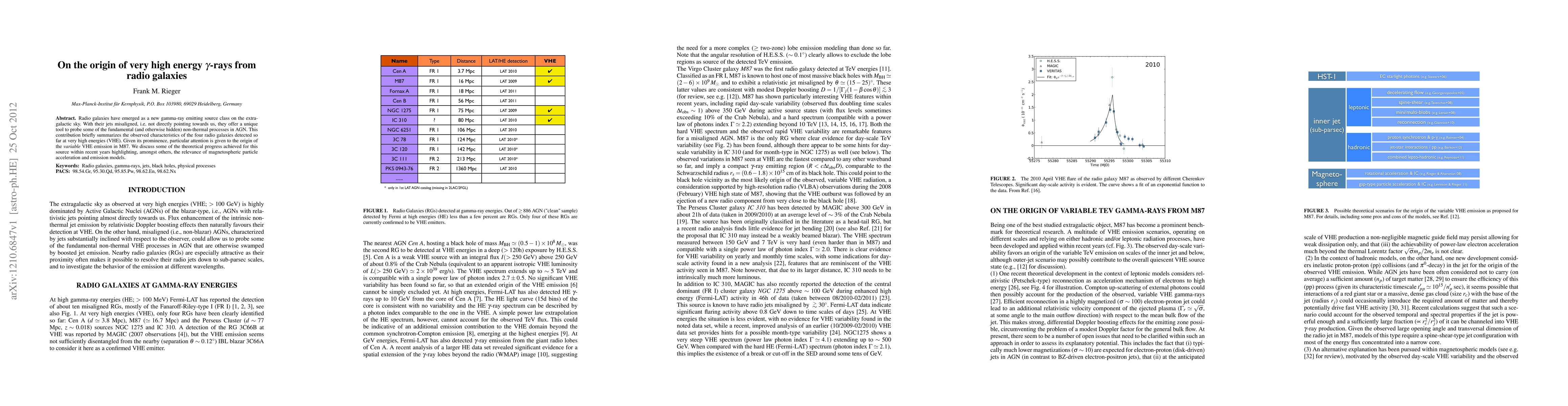 Radio galaxies have emerged as a new gamma-ray emitting source class on the extragalactic sky. With their jets misaligned, i.e. not directly pointing towards us, they offer a unique tool to probe some of the fundamental (and otherwise hidden) non-thermal processes in AGN. This contribution briefly summarizes the observed characteristics of the four radio galaxies detected so far at very high energies (VHE). Given its prominence, particular attention is given to the origin of the variable VHE emission in M87. We discuss some of the theoretical progress achieved for this source within recent years highlighting, amongst others, the relevance of magnetospheric particle acceleration and emission models.