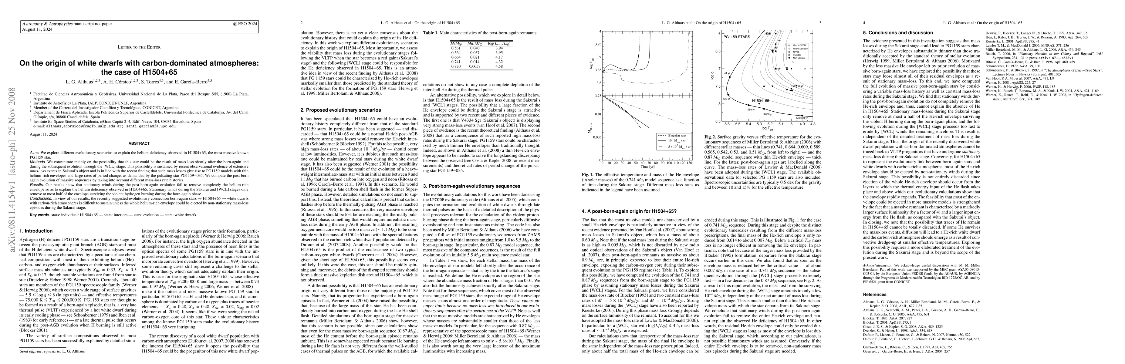 We explore different evolutionary scenarios to explain the helium deficiency observed in H1504+65, the most massive known PG1159 star. We concentrate mainly on the possibility that this star could be the result of mass loss shortly after the born-again and during the subsequent evolution through the [WCL] stage. This possibility is sustained by recent observational evidence of extensive mass-loss events in Sakurai's object and is in line with the recent finding that such mass losses give rise to PG1159 models with thin helium-rich envelopes and large rates of period change, as demanded by the pulsating star PG1159-035. We compute the post born again evolution of massive sequences by taking into account different mass-loss rate histories. Our results show that stationary winds during the post-born-again evolution fail to remove completely the helium-rich envelope so as to explain the helium deficiency observed in H1504+65. Stationary winds during the Sakurai and [WCL] stages only remove at most half of the envelope surviving the violent hydrogen burning during the born-again phase. In view of our results, the recently suggested evolutionary connection born-again stars --> H1504+65 --> white dwarfs with carbon-rich atmospheres is difficult to sustain unless the whole helium-rich envelope could be ejected by non-stationary mass-loss episodes during the Sakurai stage.